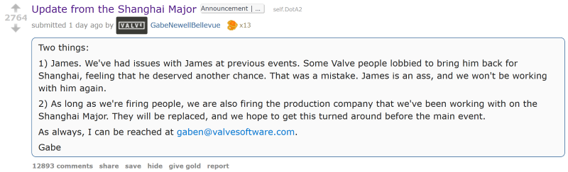This appeared to start when Gabe Newell, co-founder and managing director of Valve posted the following unprofessional rant Reddit regarding the Shanghai Major.