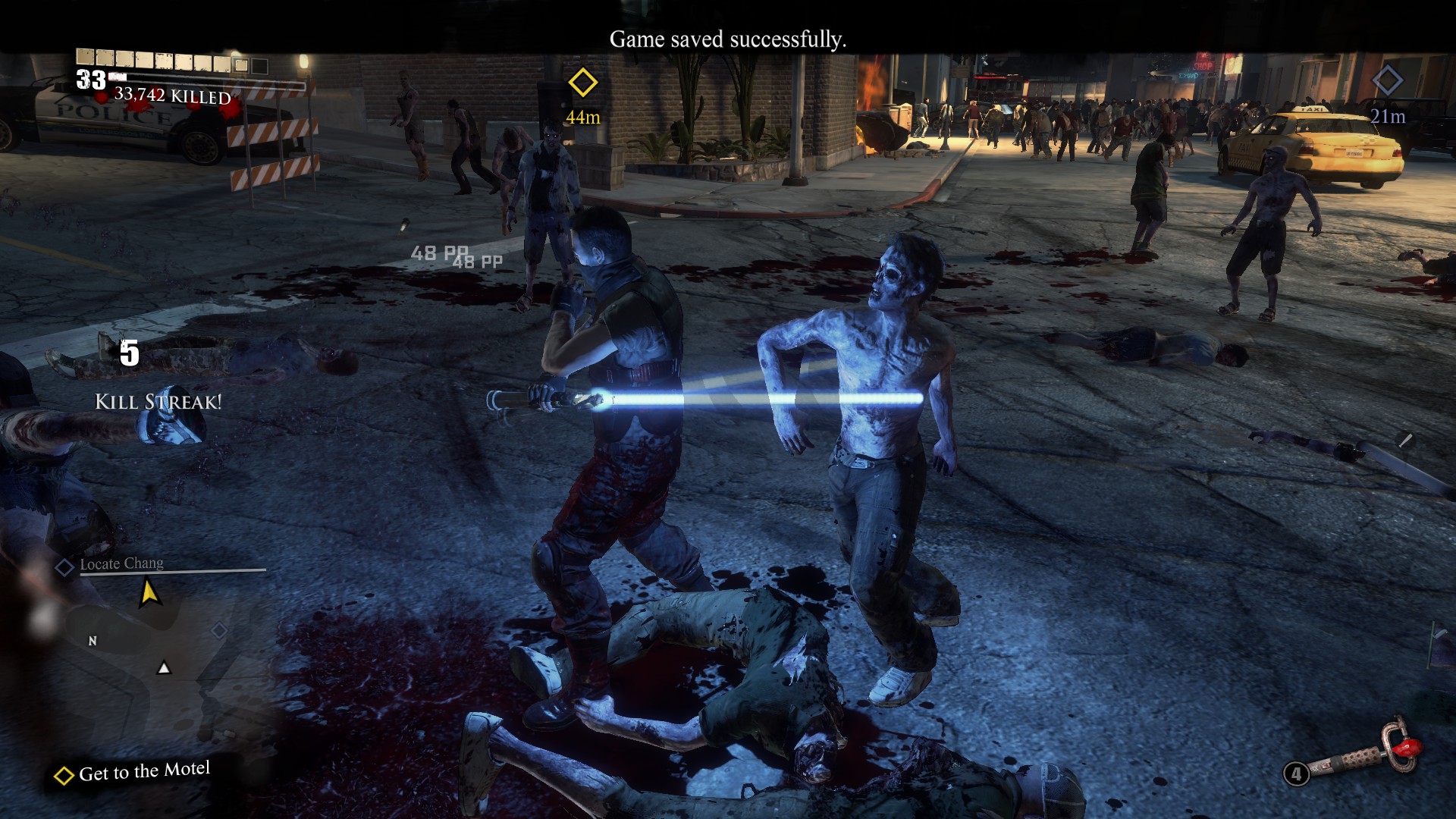 The game is set in the fictional city of Los Perdidos. You have access to almost all of the city from the end of the tutorial part of the game, and you'll find that the play area is massive compared to the previous two games. The move to the next generation of consoles also allowed the game designers to significantly up the numbers of zombies in the horde so there are at times, whilst out in the streets, a lot more zombie fodder to hack your way through. One of my gripes from the previous game was having to return to a workbench every time I wanted to combine two items to make an awesome weapon, in Dead Rising 3 Nick can combine the weapons anywhere. All of the weapons that I can recall enjoying from the previous game are back, and there are even more weapon combos that can be constructed. PC players will find that they have the 'Apocalypse Edition' of the game which includes a load of weapons that would have been DLC / unlockable on the Xbox. These can be found in the weapons lockers in the various safe zones throughout the city. I would advise using these super weapons sparingly as they can upset the balance of the game and make it a little too easy.