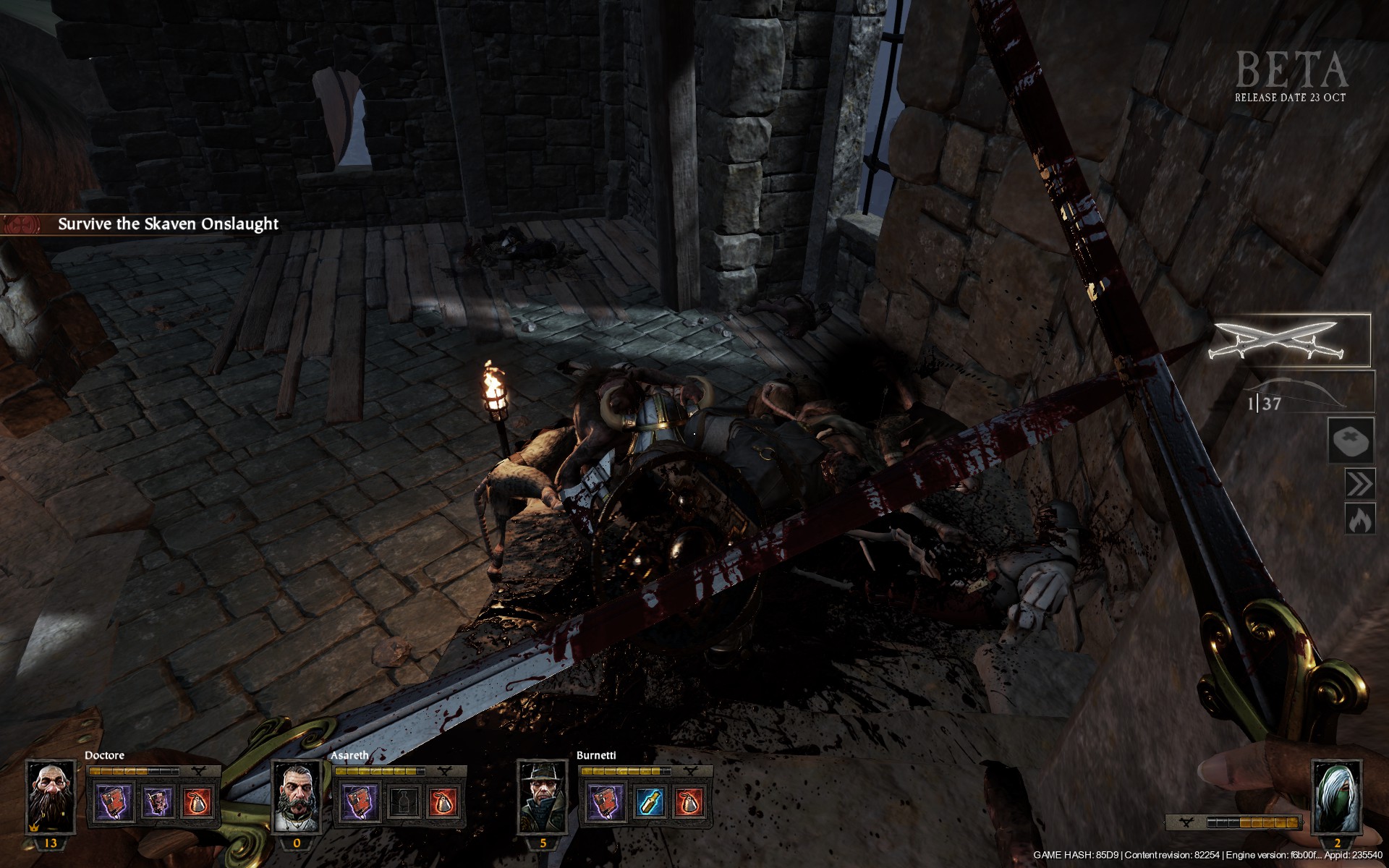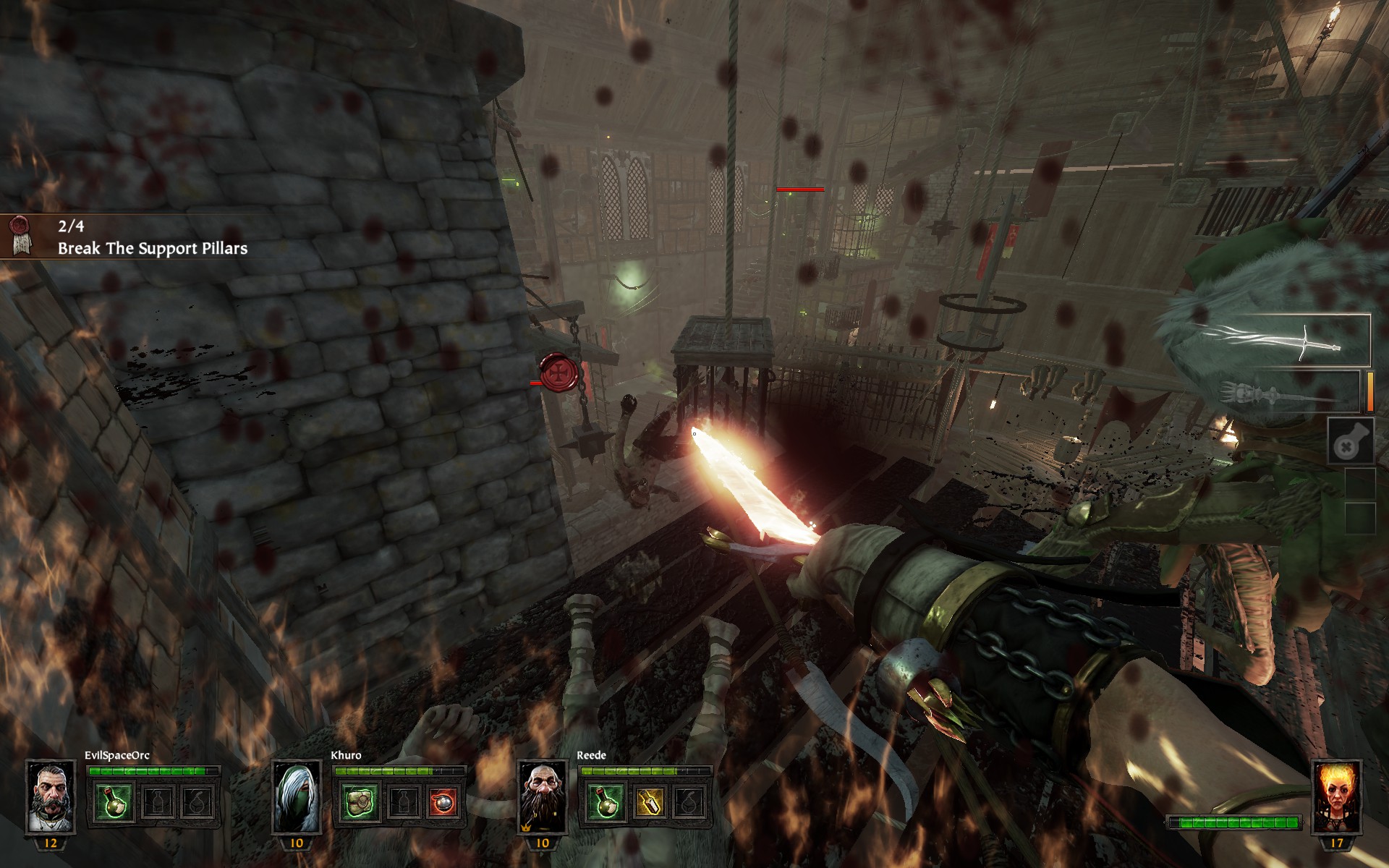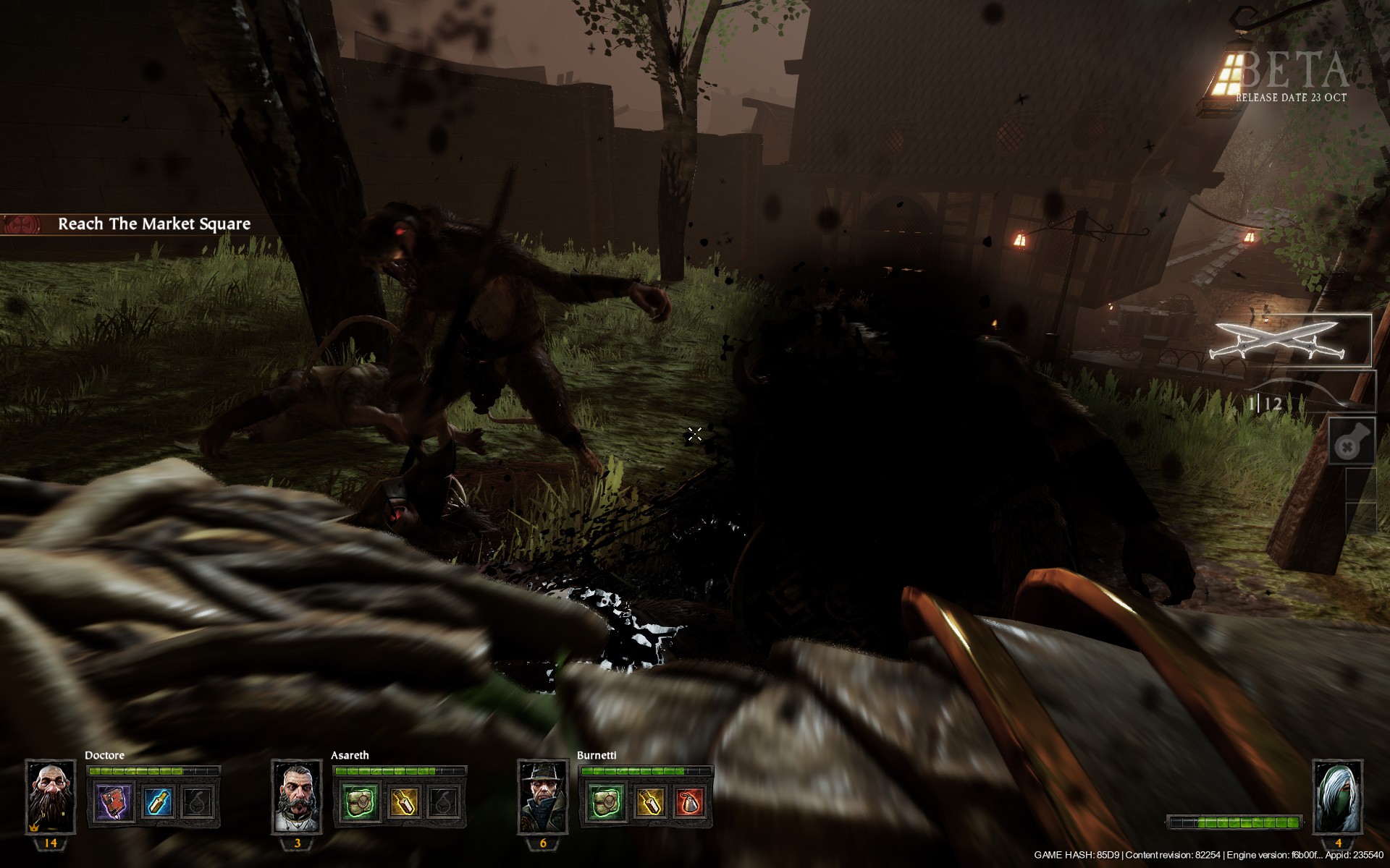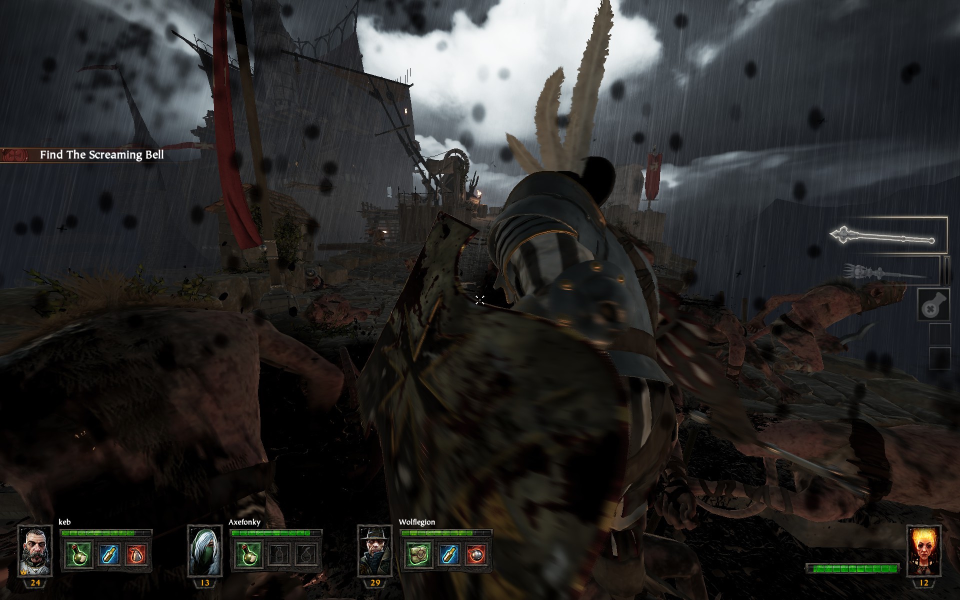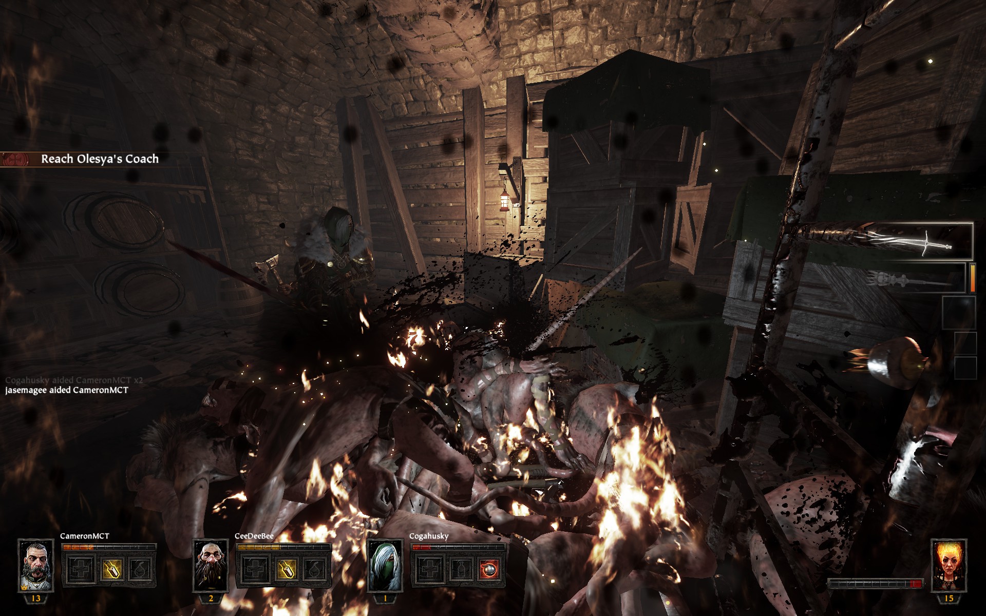 Launching the game you start off in a tavern which has a map to start the game, an anvil to craft and a container to store items. You can play one of five classes which are a the Witch Hunter (guns & rapiers), Bright Wizard (fire mage with fire sword), Dwarf Ranger (tank with shield), Waywatcher (bows & daggers) and the Empire Soldier (big melee weapons). You can start the game by playing with randoms or via a party and selecting the mission on the map. You’re very much thrown in at the deep end with other people for the first game. Controls as what you’d expect, you have a main attack and power attack for each weapon and the ability to block and push-back opponents with some weapons.