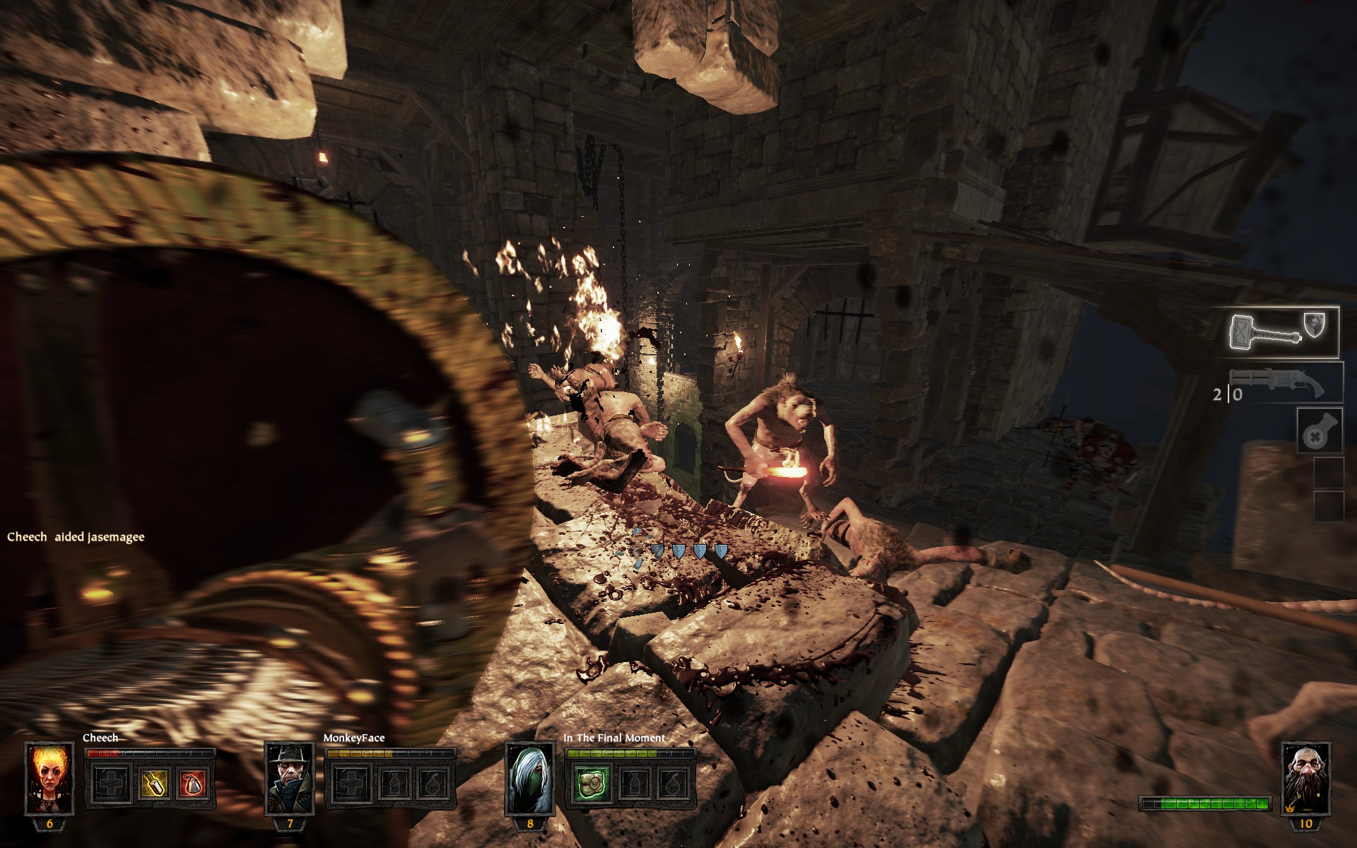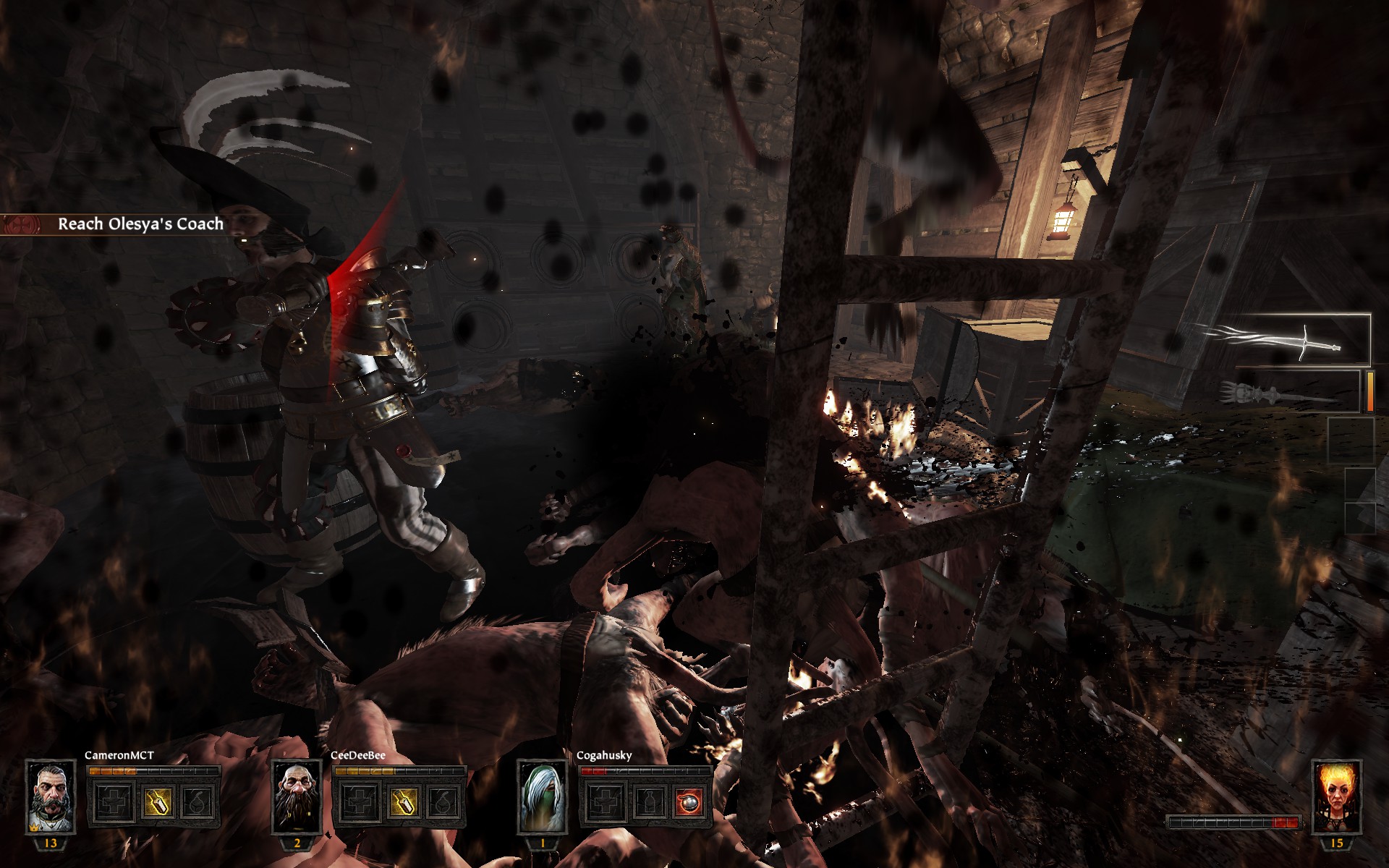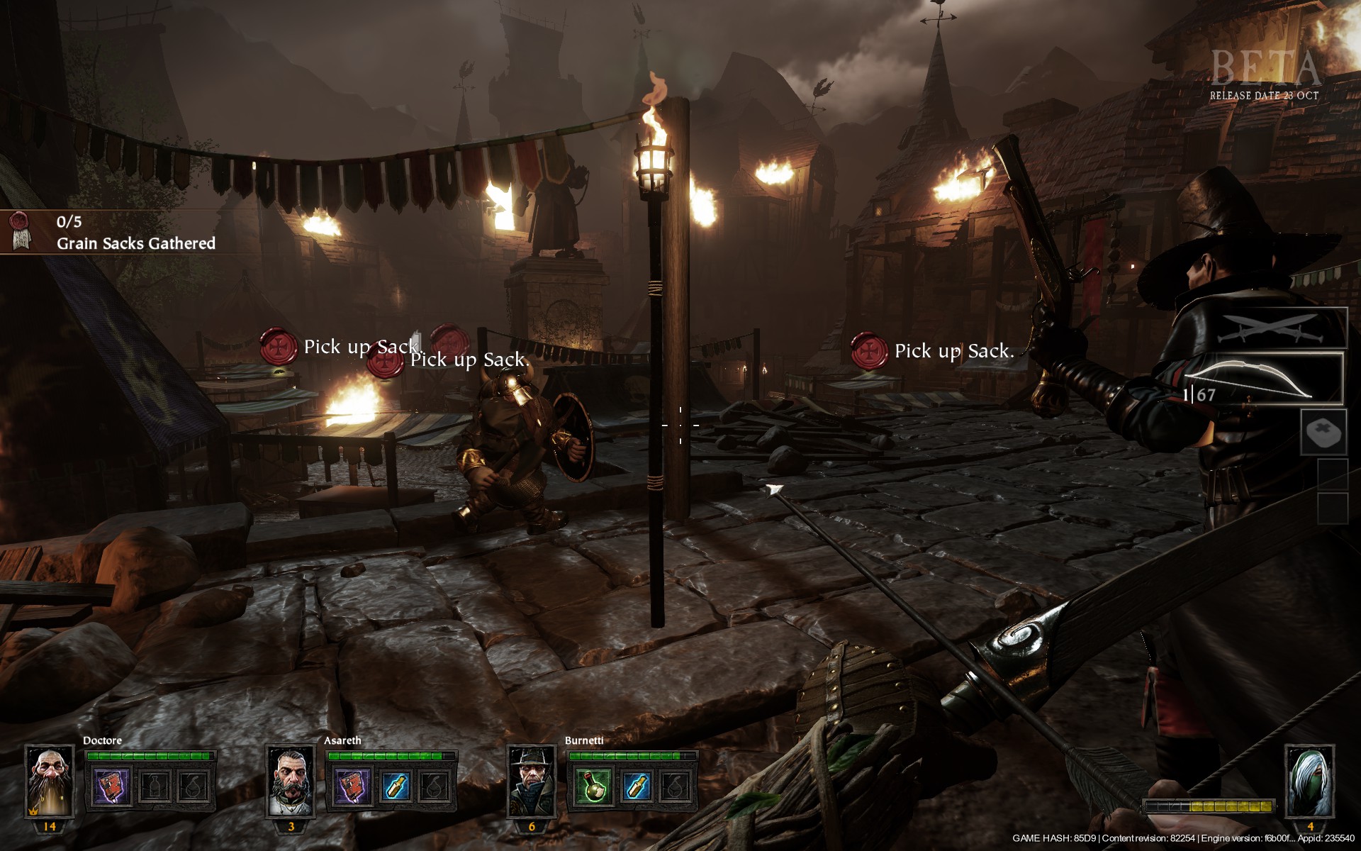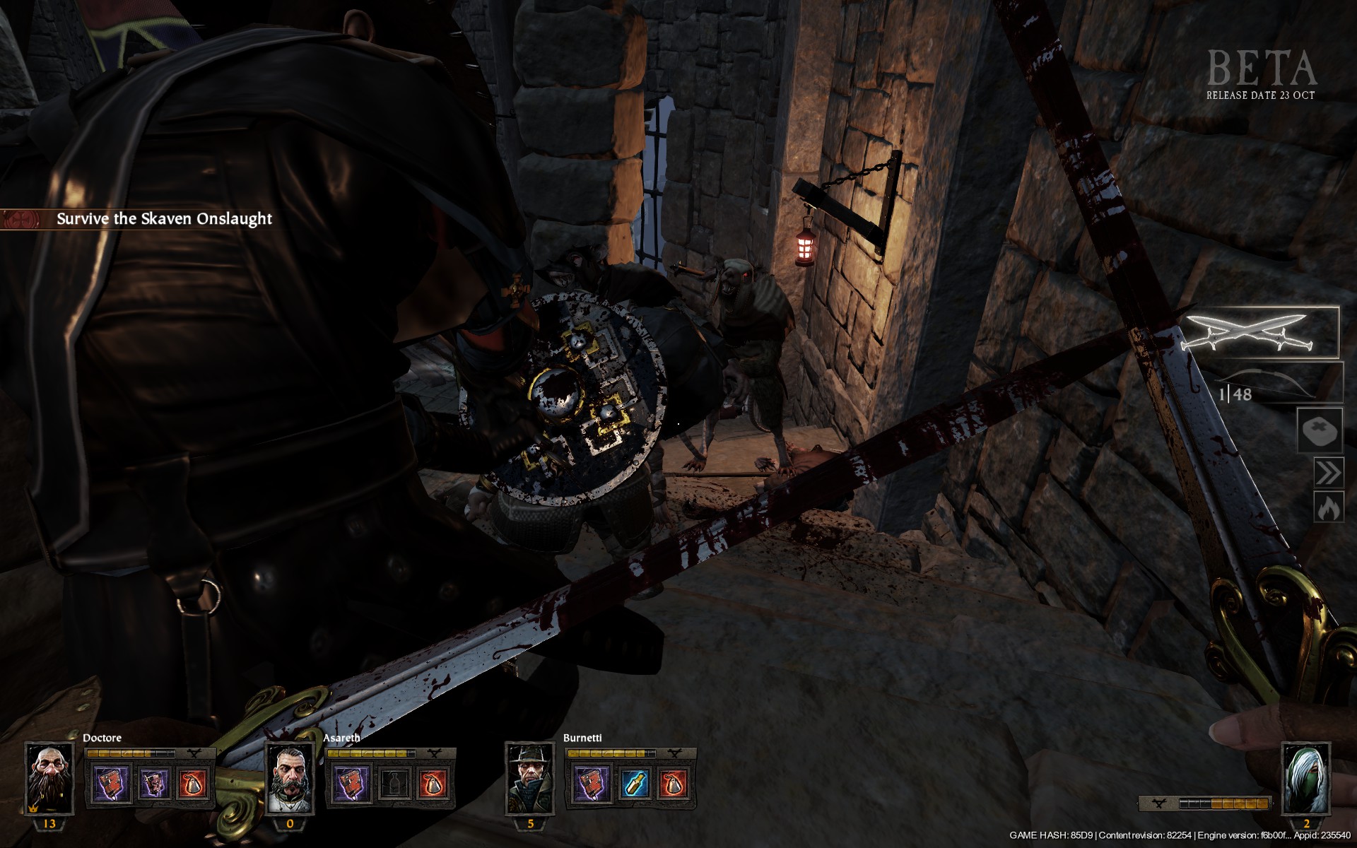 Launching the game you start off in a tavern which has a map to start the game, an anvil to craft and a container to store items. You can play one of five classes which are a the Witch Hunter (guns & rapiers), Bright Wizard (fire mage with fire sword), Dwarf Ranger (tank with shield), Waywatcher (bows & daggers) and the Empire Soldier (big melee weapons). You can start the game by playing with randoms or via a party and selecting the mission on the map. You’re very much thrown in at the deep end with other people for the first game. Controls as what you’d expect, you have a main attack and power attack for each weapon and the ability to block and push-back opponents with some weapons.