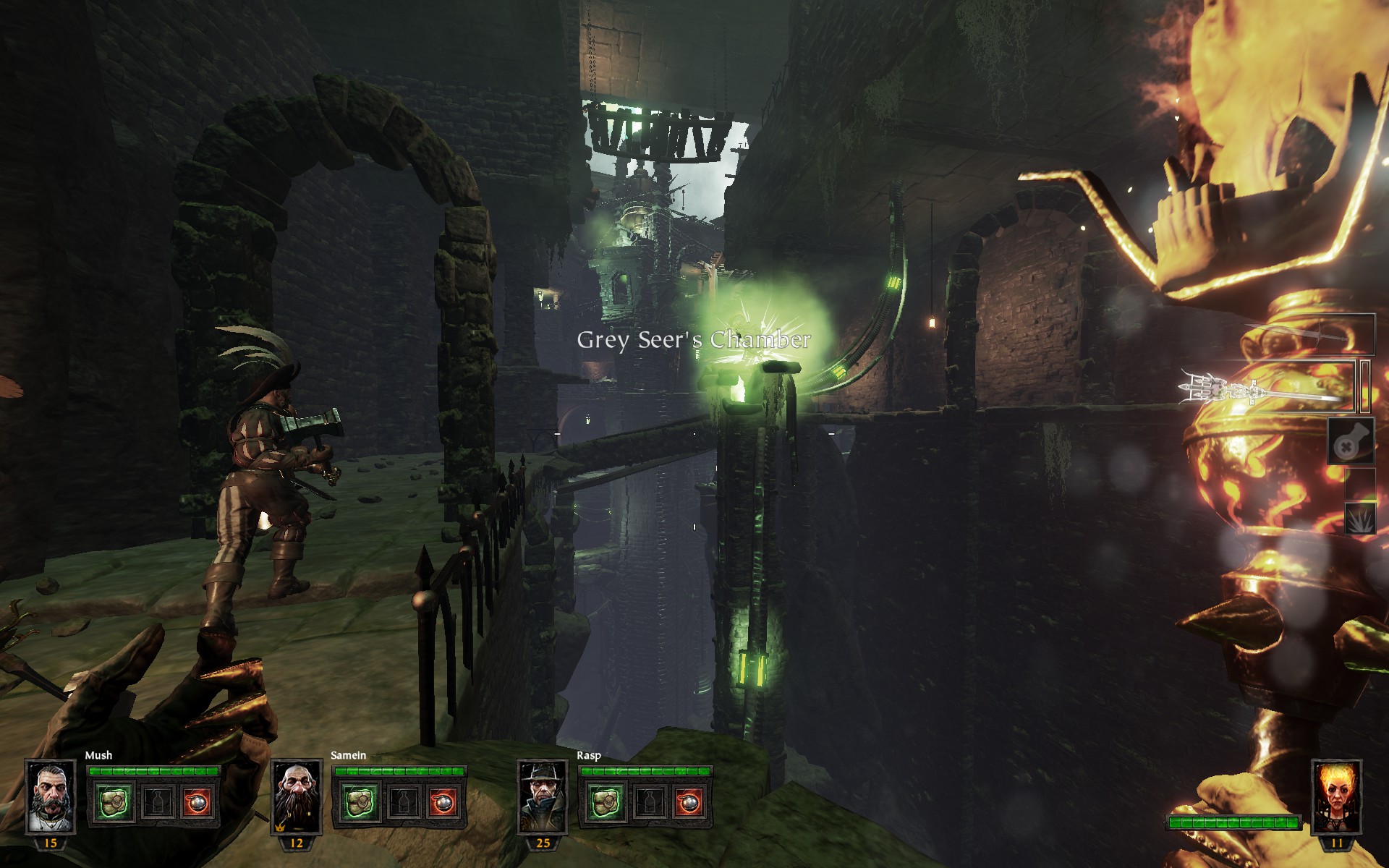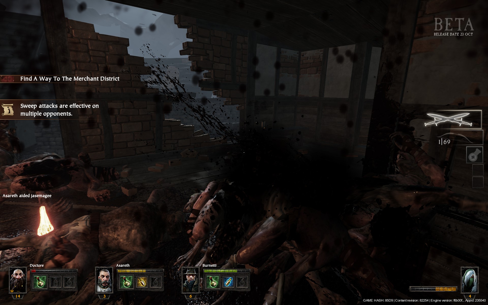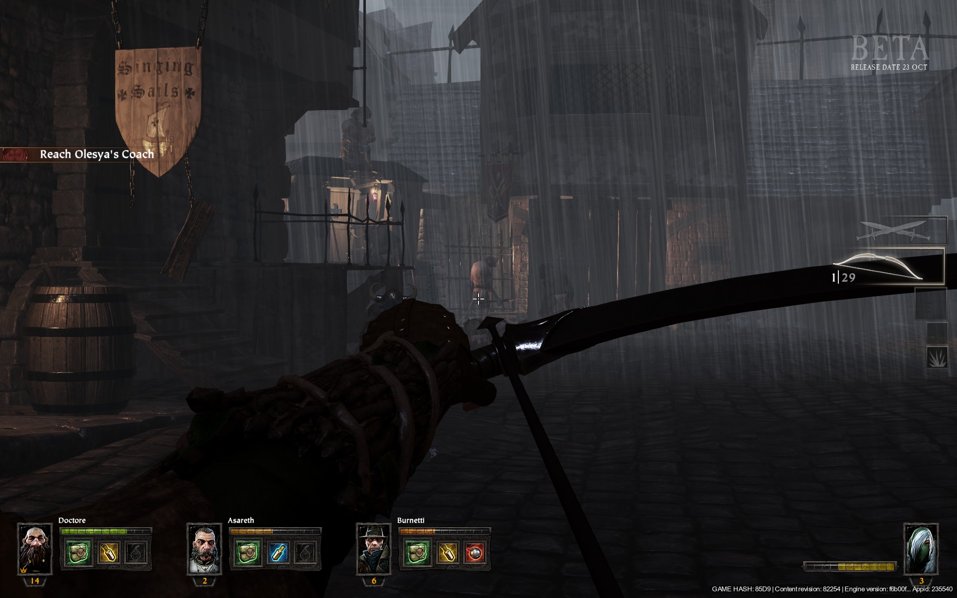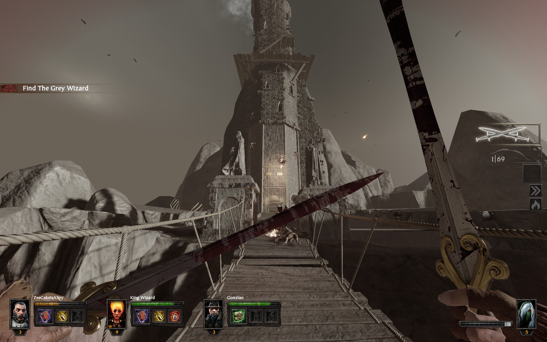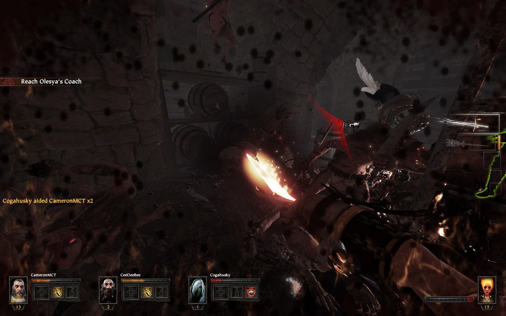 Launching the game you start off in a tavern which has a map to start the game, an anvil to craft and a container to store items. You can play one of five classes which are a the Witch Hunter (guns & rapiers), Bright Wizard (fire mage with fire sword), Dwarf Ranger (tank with shield), Waywatcher (bows & daggers) and the Empire Soldier (big melee weapons). You can start the game by playing with randoms or via a party and selecting the mission on the map. You’re very much thrown in at the deep end with other people for the first game. Controls as what you’d expect, you have a main attack and power attack for each weapon and the ability to block and push-back opponents with some weapons.