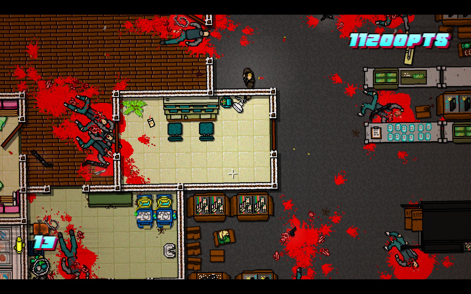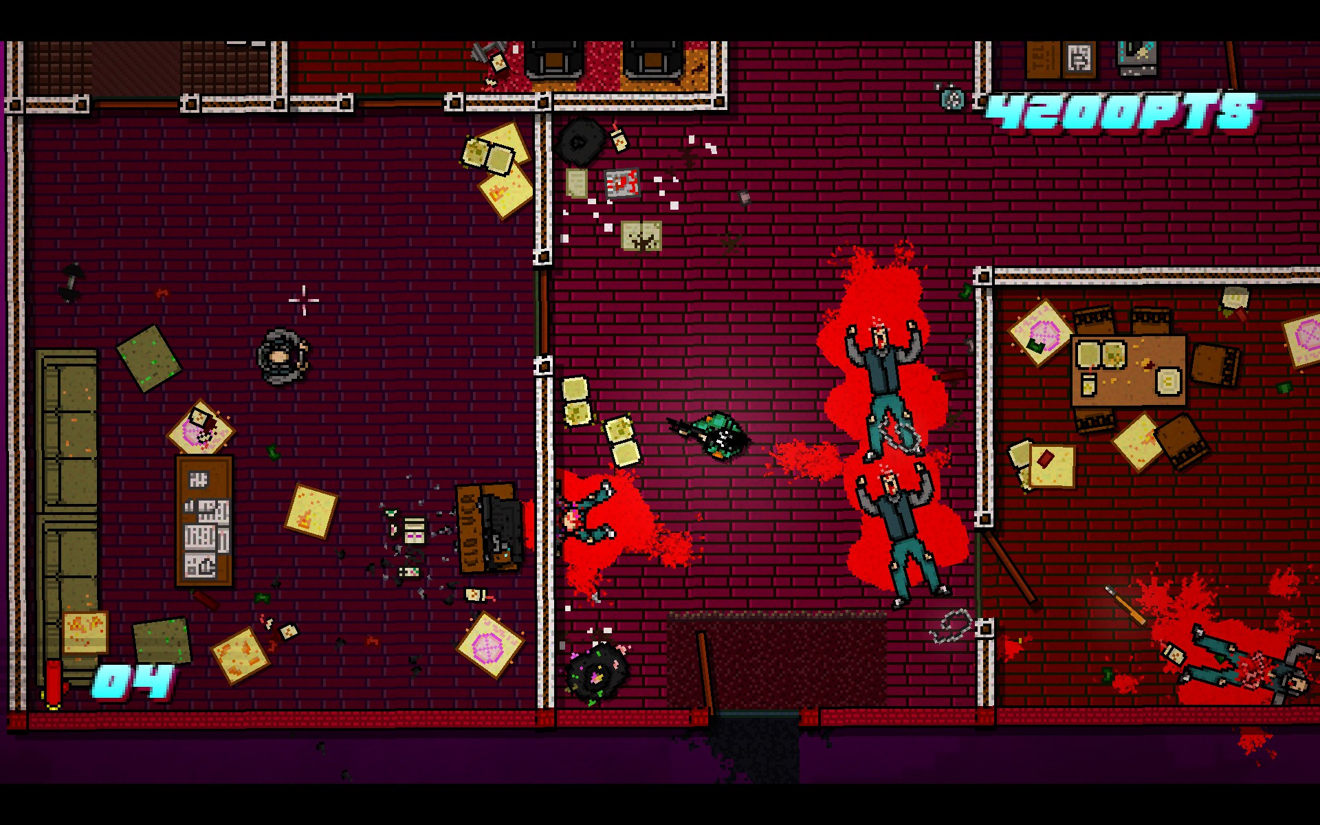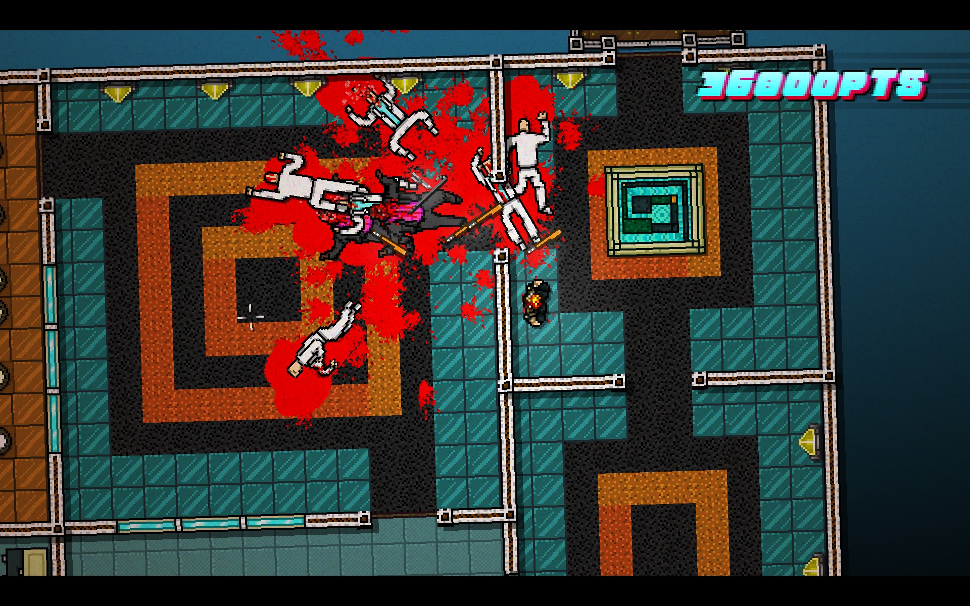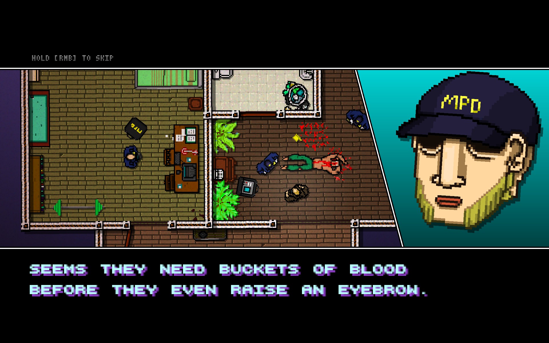 Like the previous Hotline Miami, you can choose a mask at the start of some missions which have different pros and cons. One mask gave me two characters, one with a chainsaw and one with a gun which in practice was very difficult to control. Another mask gave me a character dual wielding sub machine guns, which was a lot of fun.