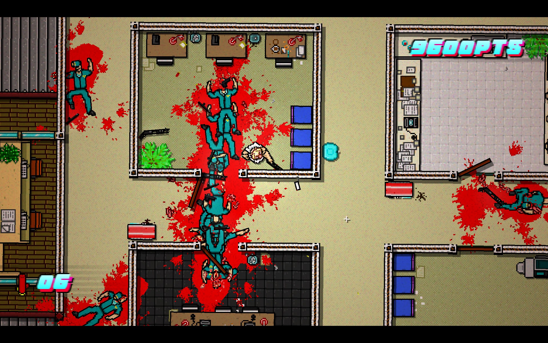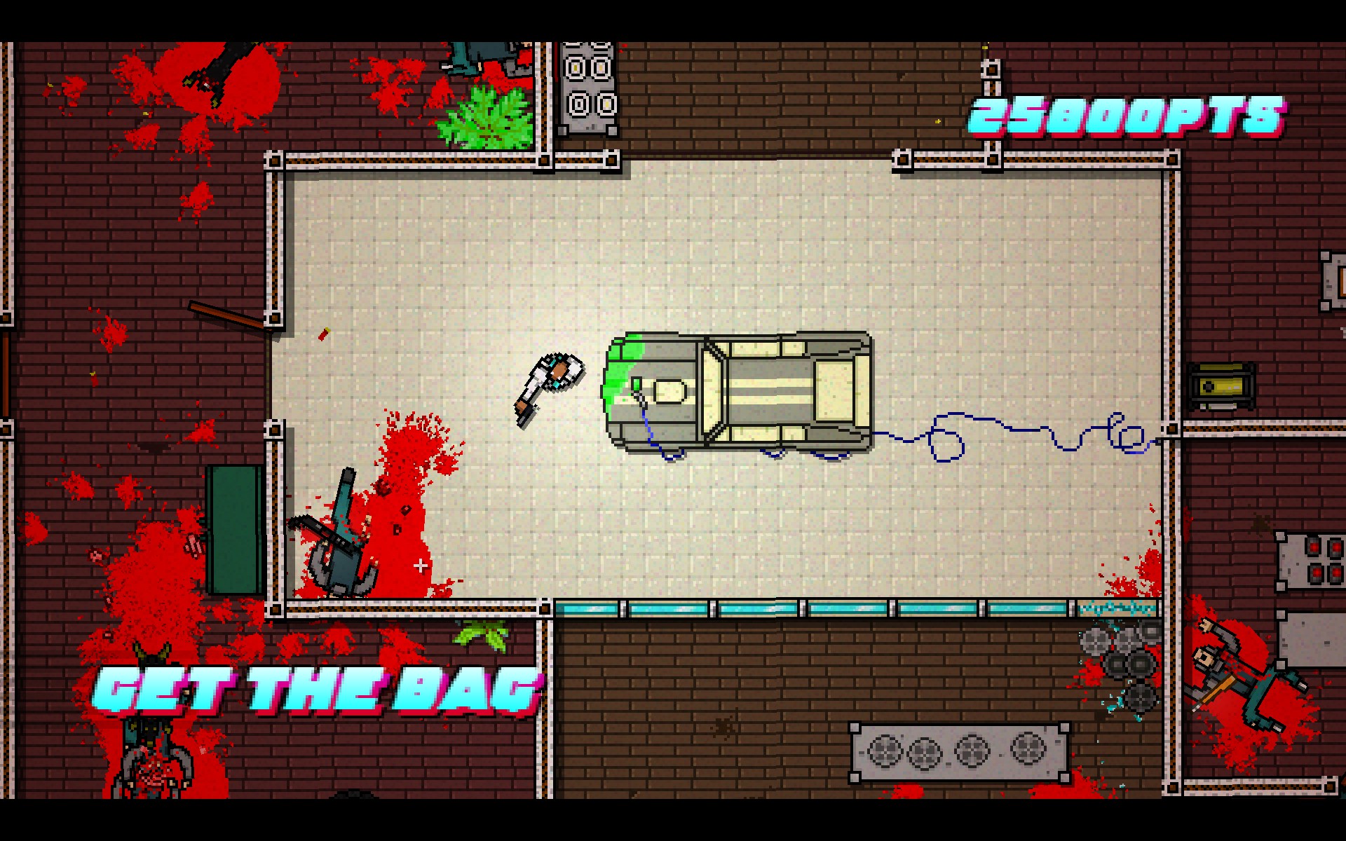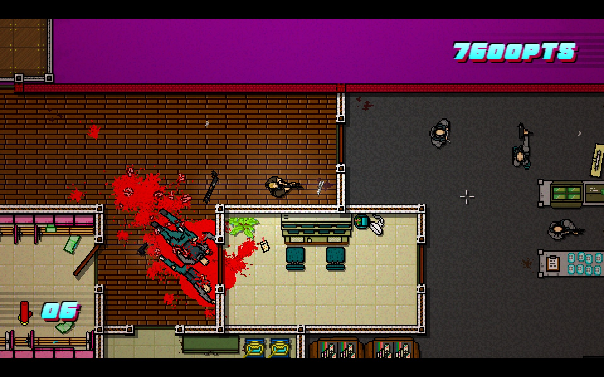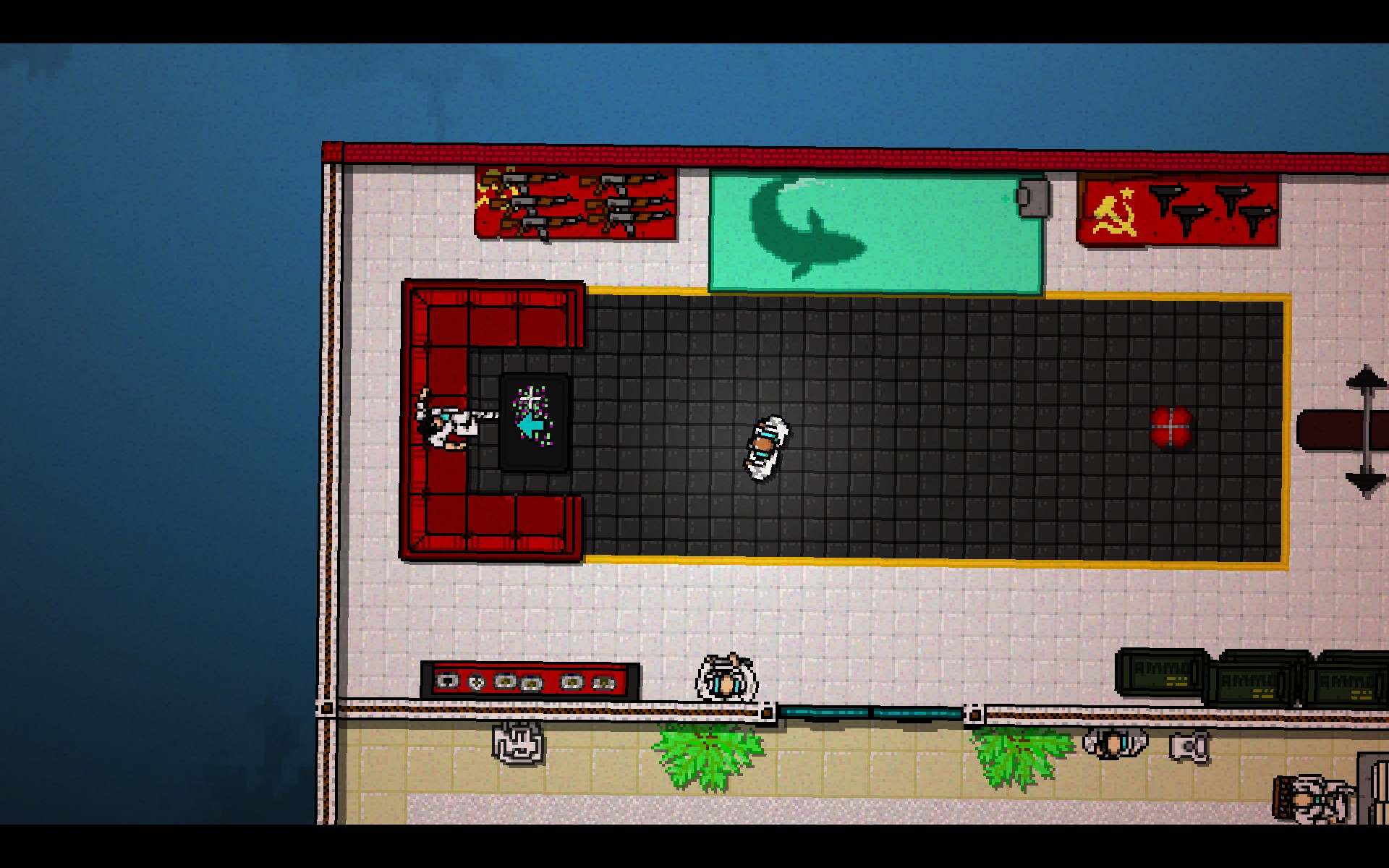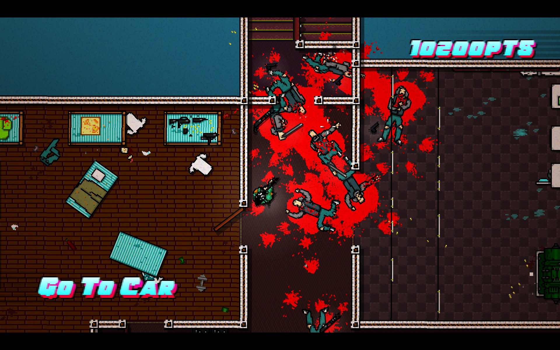 Like the previous Hotline Miami, you can choose a mask at the start of some missions which have different pros and cons. One mask gave me two characters, one with a chainsaw and one with a gun which in practice was very difficult to control. Another mask gave me a character dual wielding sub machine guns, which was a lot of fun.
