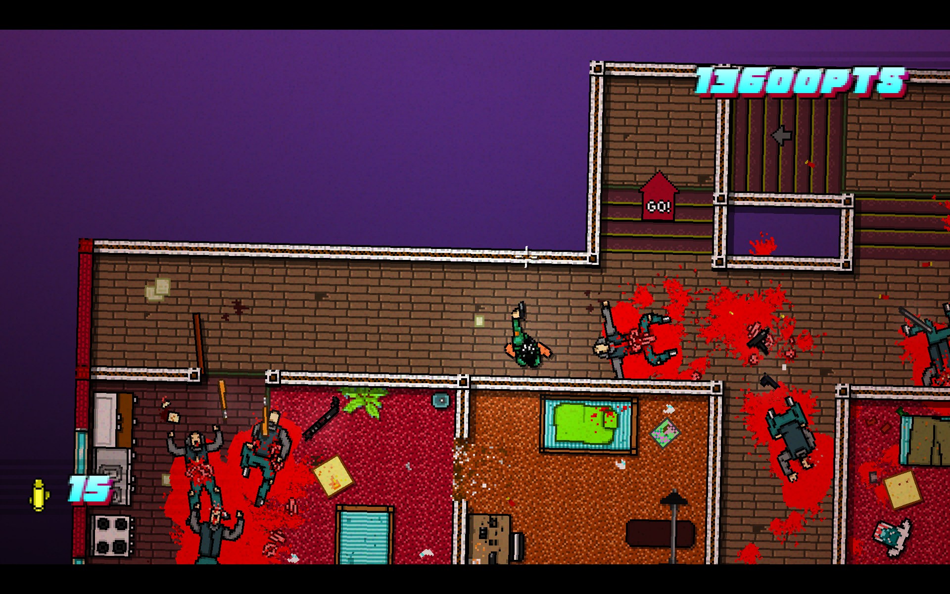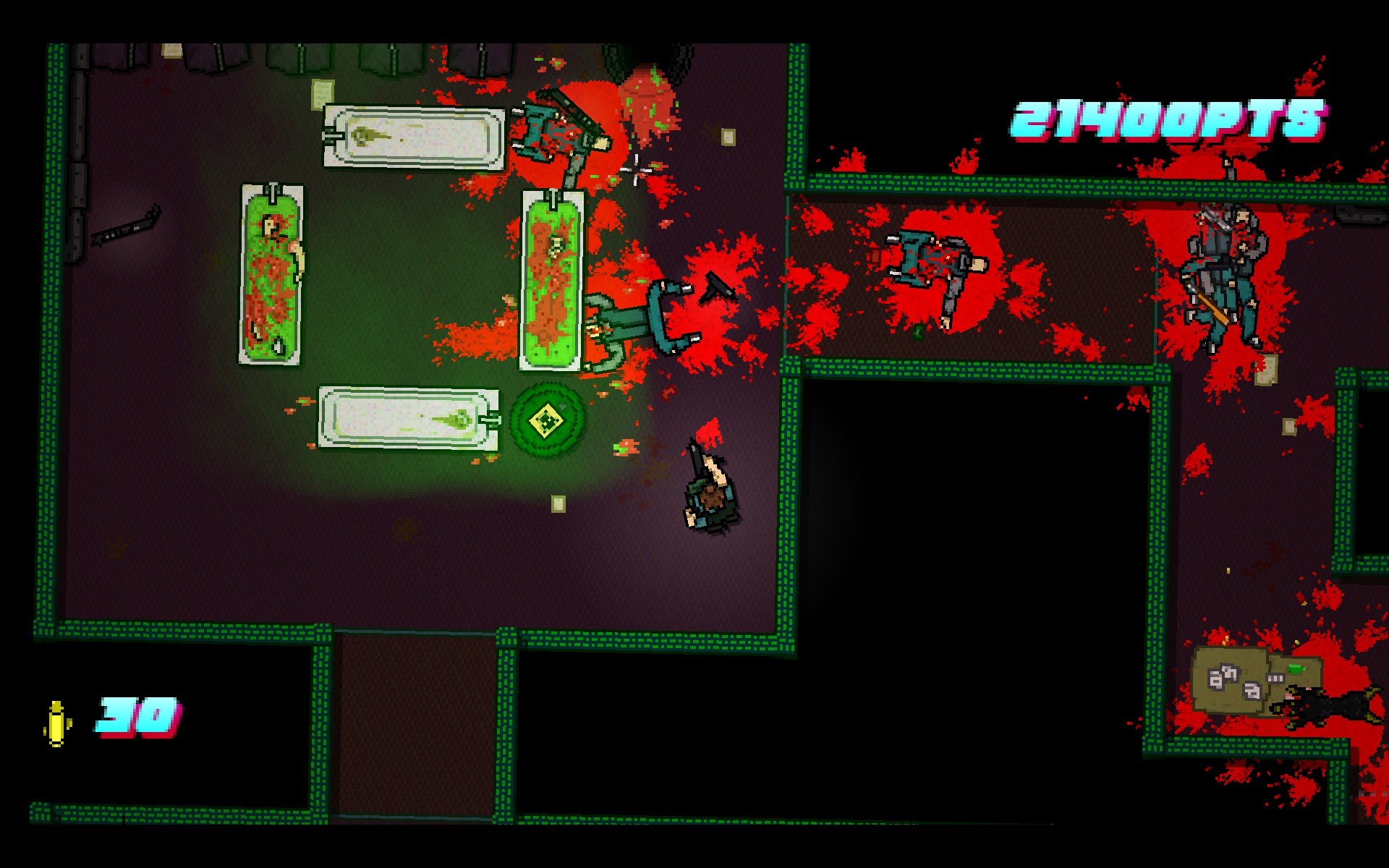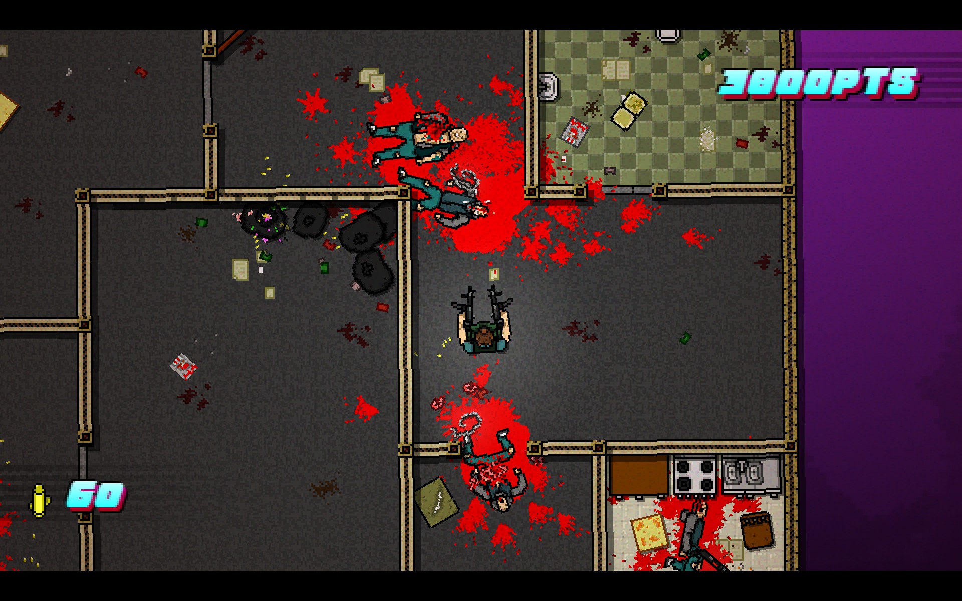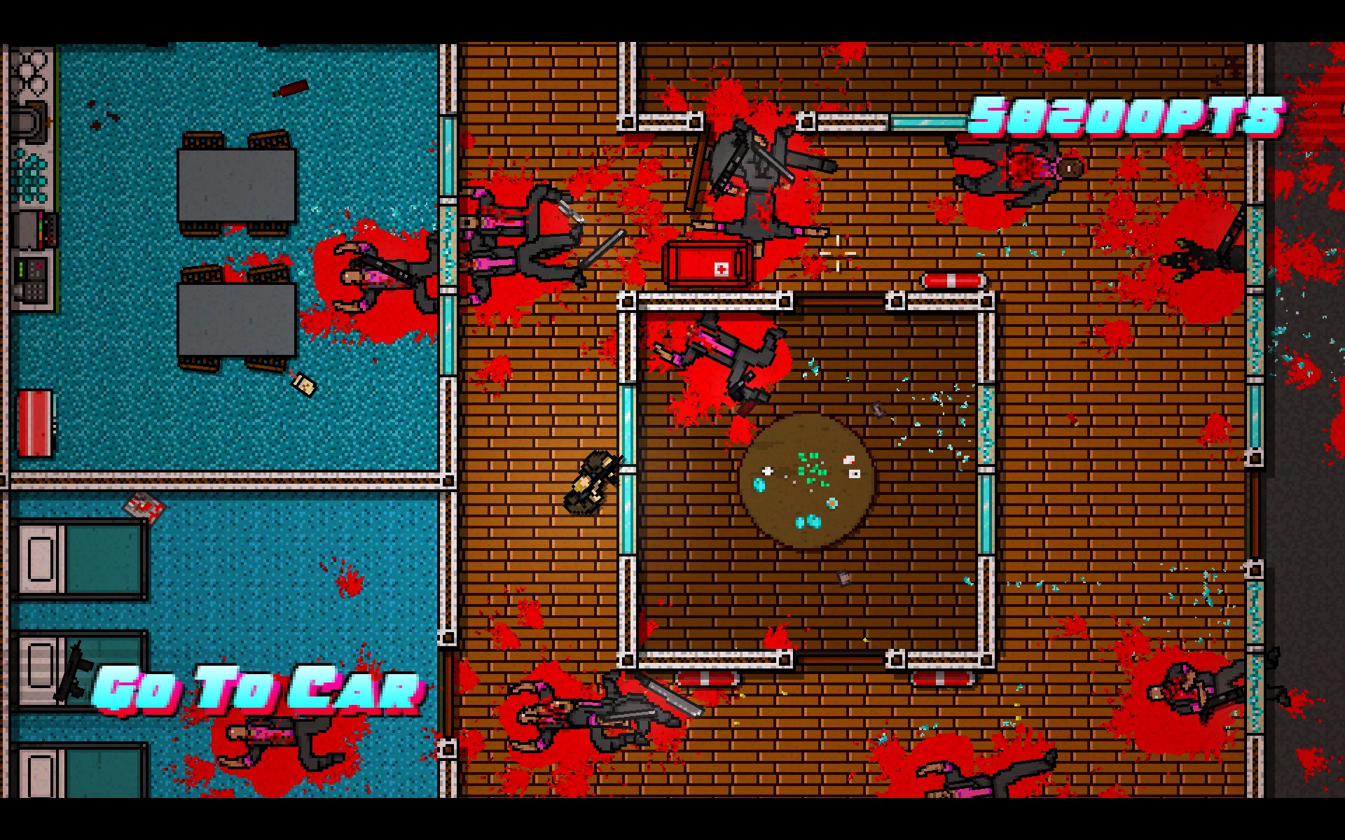 Like the previous Hotline Miami, you can choose a mask at the start of some missions which have different pros and cons. One mask gave me two characters, one with a chainsaw and one with a gun which in practice was very difficult to control. Another mask gave me a character dual wielding sub machine guns, which was a lot of fun.