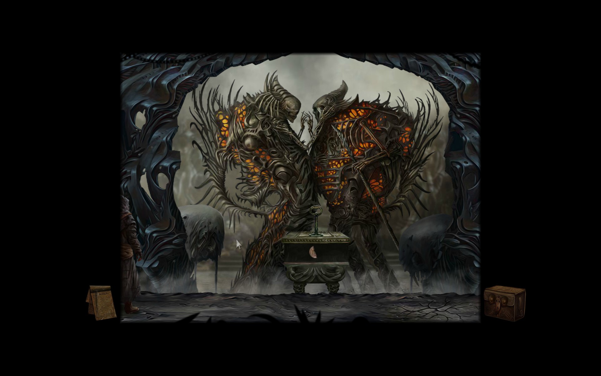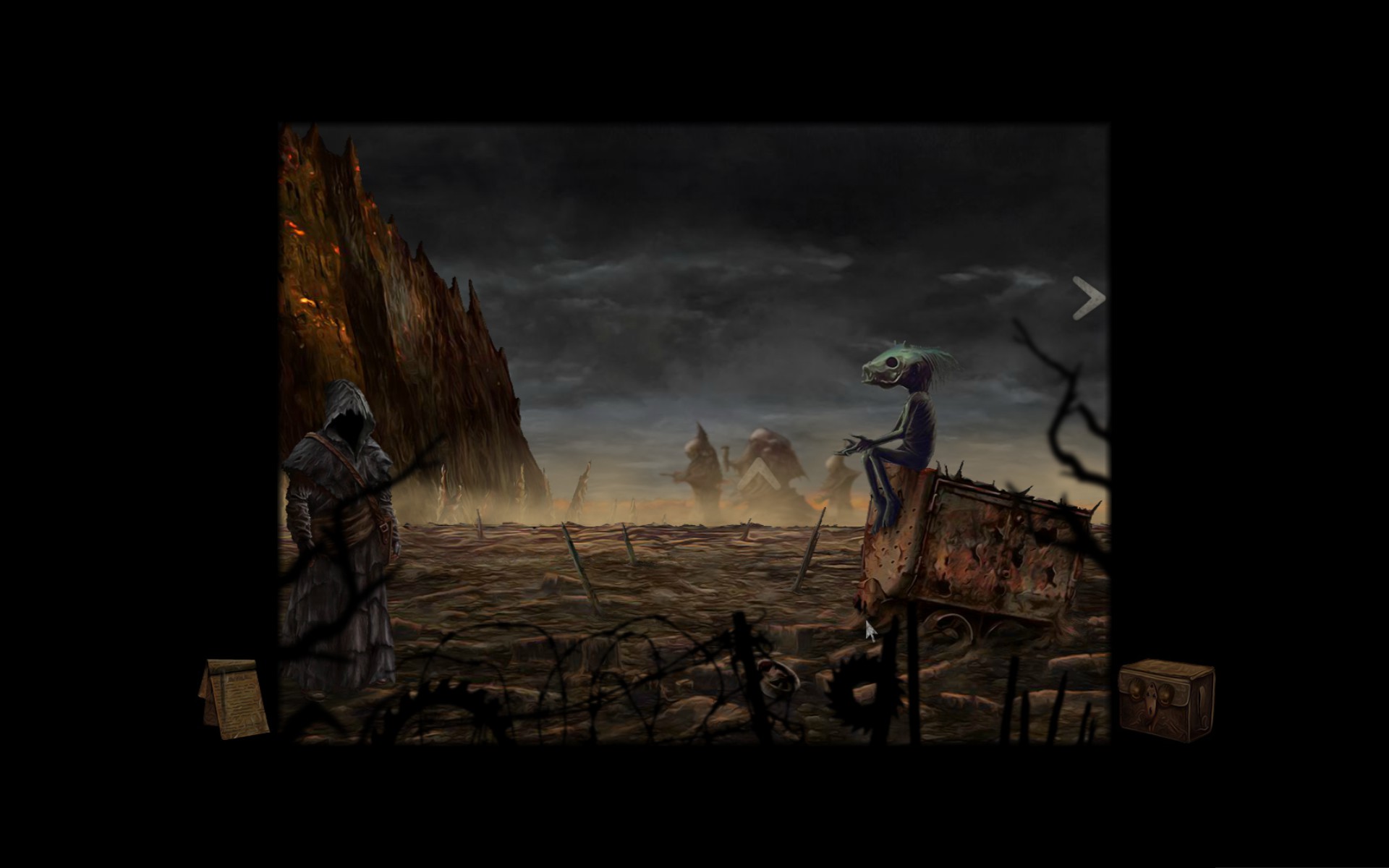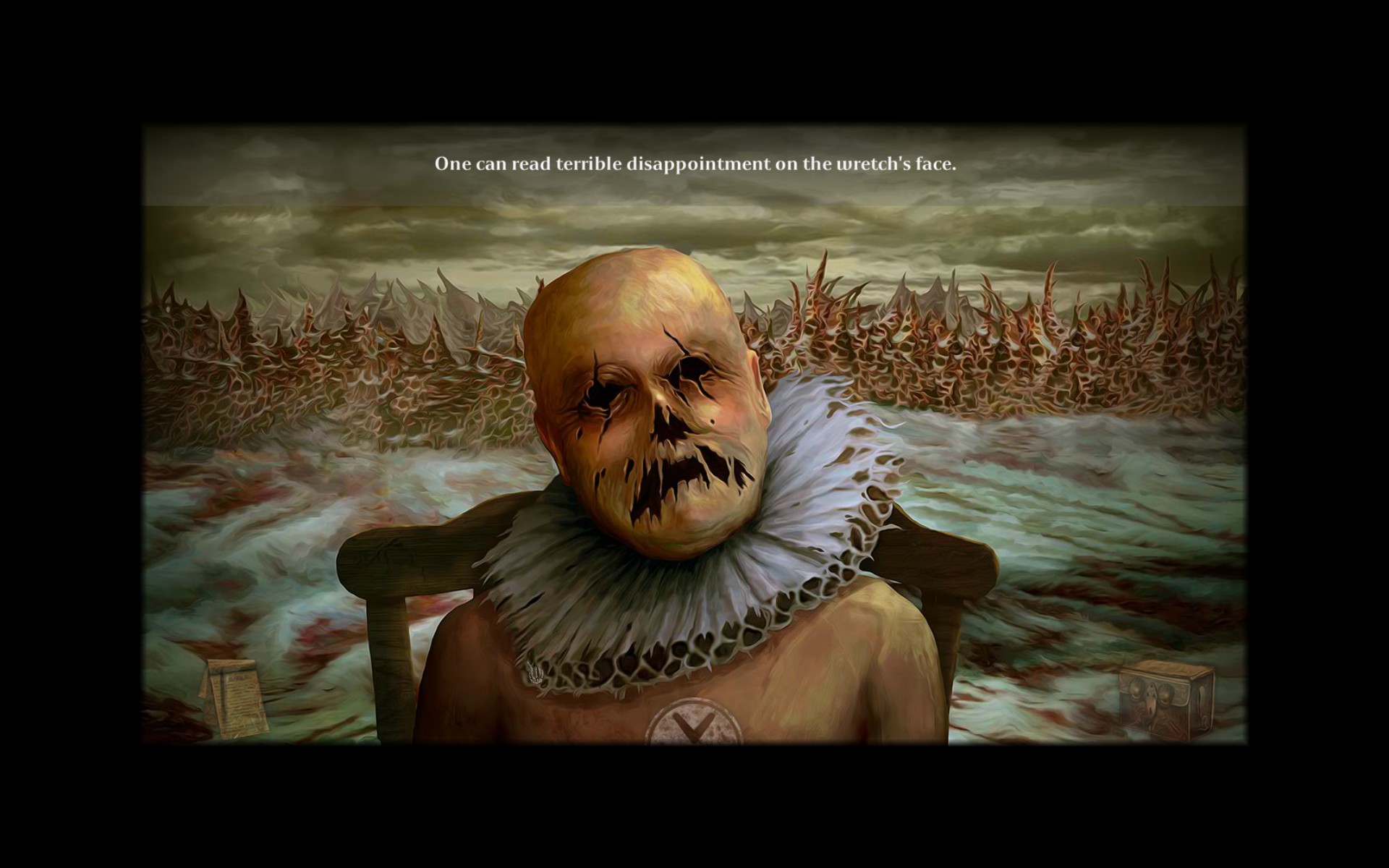 Gameplay involves clicking to interact with objects and clicking on arrows at the edges of the screen to move between areas. Your character does not move. Dialogue with other characters is one way and has no options. Usually the dialogue will prompt you to make a decision in order to progress. For example, after speaking to a jester I had to decide weather to kill a caged woman or set her free. All these the kinds of decisions are remembered and used to pick the game ending you receive.