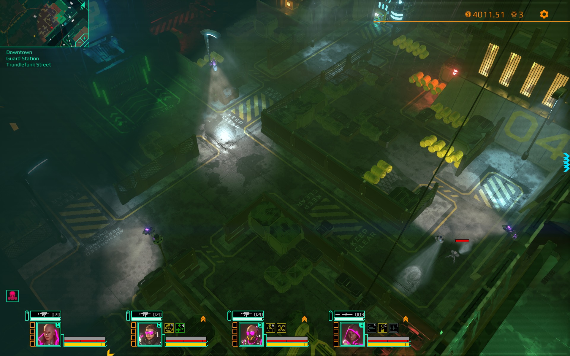 At the core the game’s main objective is to infiltrate a bunch of enemy compounds and get your team inside the facility at the heart of it. Your team consists of a soldier (big guns), support (team buffs), a hacker (takes control of enemies and hacks things) and an infiltrator (stealth kills, can go invisible). Entering the facilities will grant you different things, for example a bank will give you lots of cash, the CCTV facility will increase the amount of time it takes for cameras to spot you and enemy compounds will give you items, reduce alarm responses, etc. You do this in four districts until your team is powerful enough to tackle the end boss. Not all the facilities are mandatory but you’ll probably want to do most of ‘em!