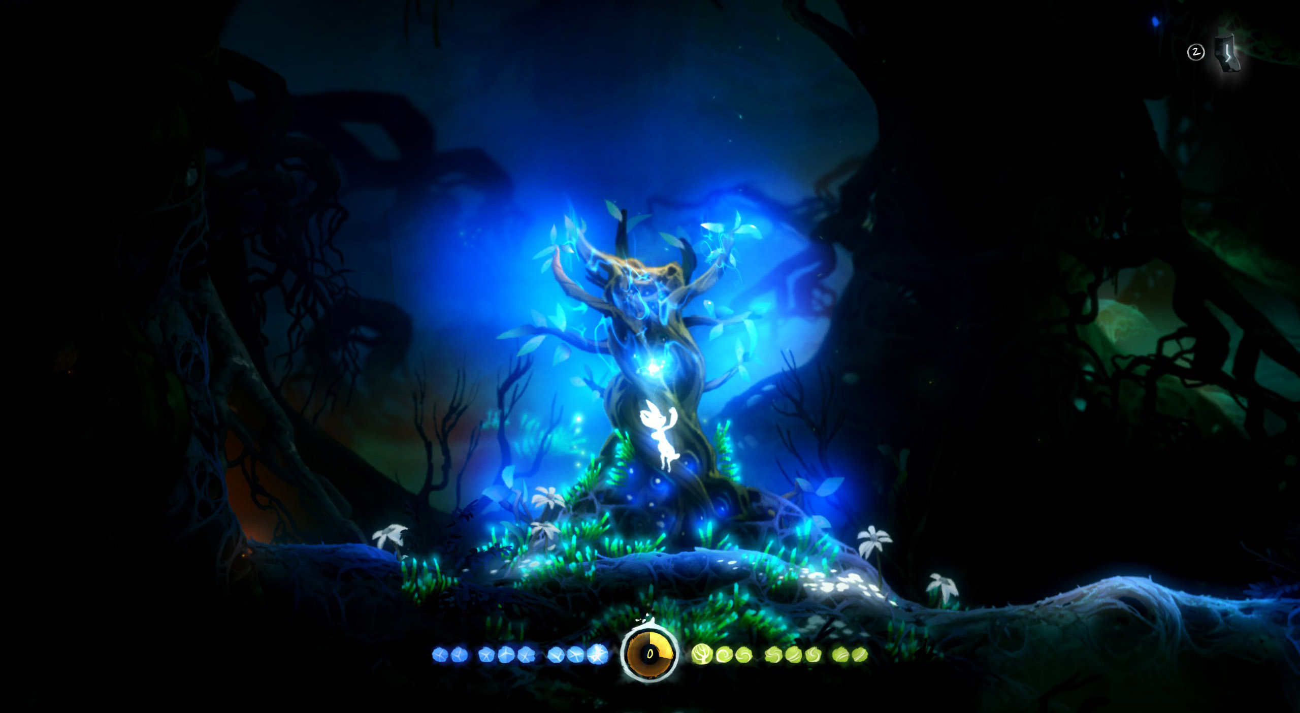 The world is one big map, progression is generally linear, because the routes ahead are unlocked through gaining of new skills and abilities, such as double jump, wall jumping, swimming, gliding, etc. You can augment your abilities with spirit points to upgrade your powers, e.g. more missiles from Sein to fight the enemies, triple jump, or more health. You can plant soul links on safe flat terrain which are essentially custom player controlled checkpoints. This sounds like a great idea until you do a super amazingly difficult sequence of jumps, glides, zooms and then forget to drop a soul link and die to an embarrassing mistake and then have to re-do the entire sequence again. On the whole, the soul link system is fine and works most of the time, even if I did start obsessively compulsively dropping them as often as I would save my work in a dodgy old Microsoft Office suite.