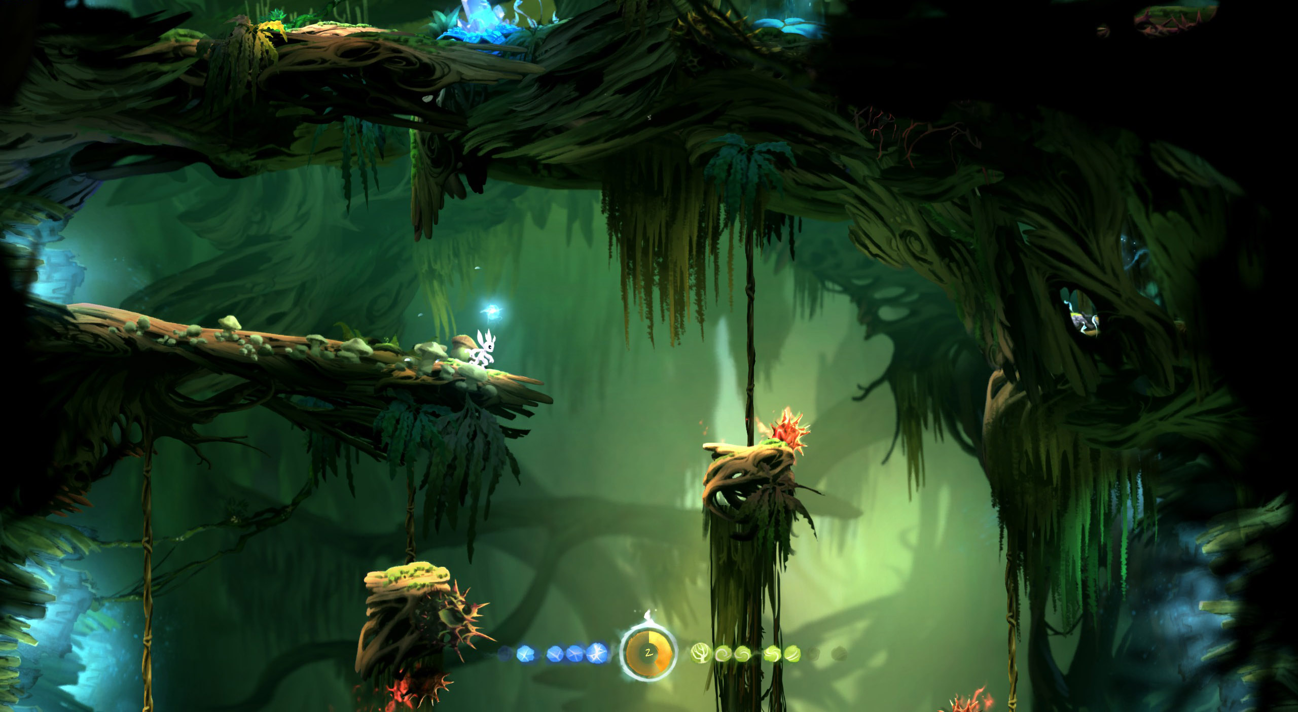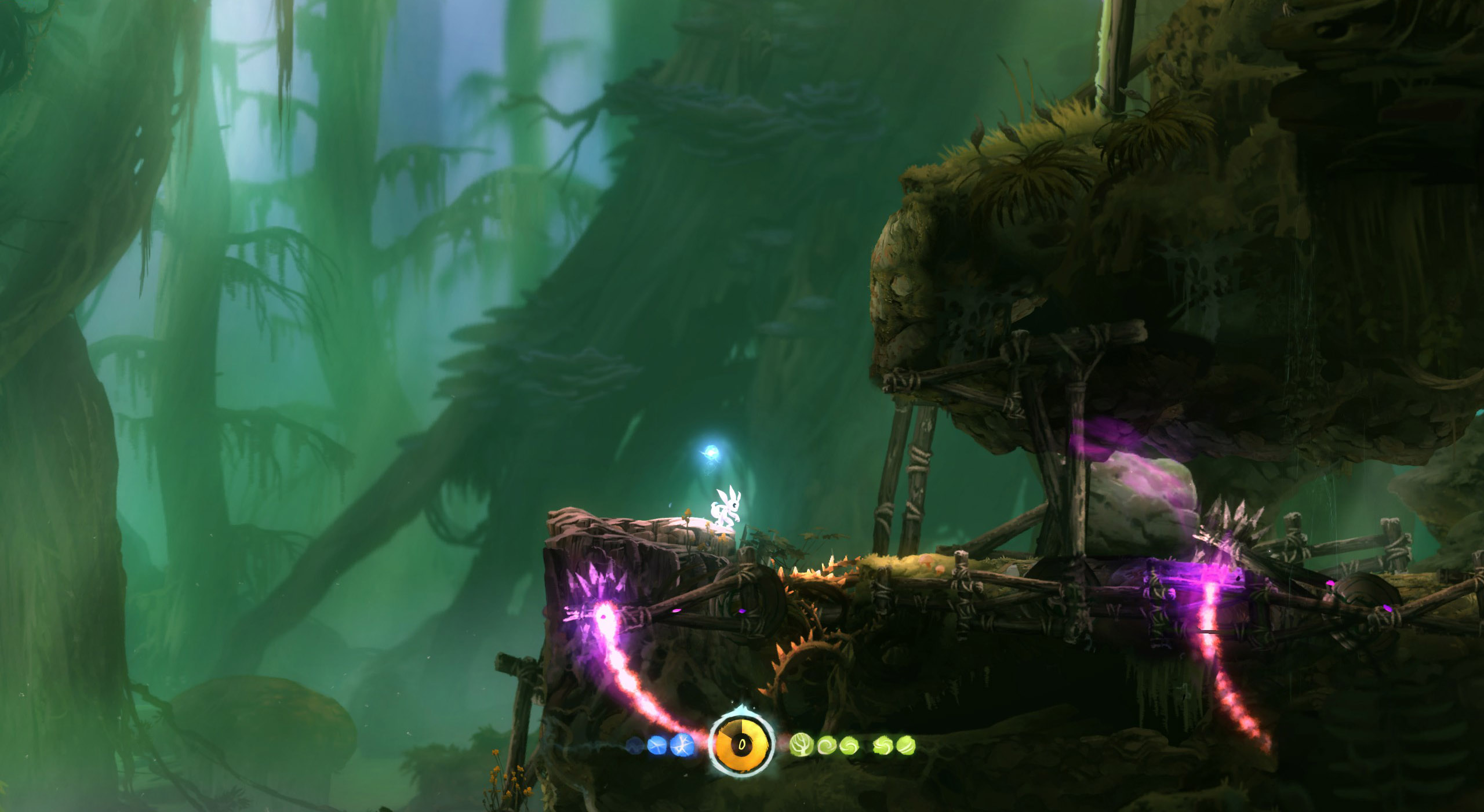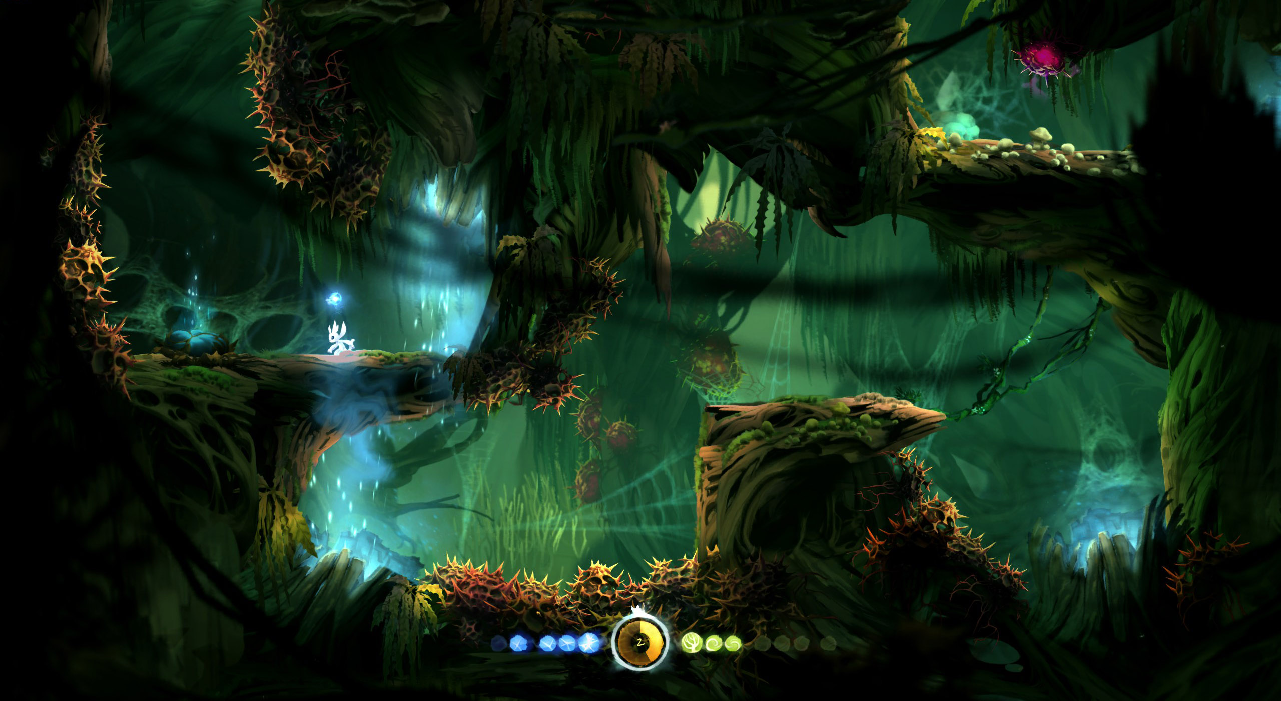 From the onset Ori and the Blind Forest is just stunningly beautiful, everything appears hand painted similar to the recent Rayman games, and I would say I preferred Ori’s art style over Rayman’s. The game starts with Ori, a white guardian spirit, who falls from the Spirit Tree as essentially a newborn. He is adopted and cared for by Naru, a sort of cute gorilla like creature. Unfortunately the forest begins to wither and die and Ori is left to explore the forest with the aim of restoring it on his own. Like Pixar’s film Up Ori’s intro sequence’s storytelling is so involving and affecting that it really made me care about the characters in only a few minutes. Ori is joined on his adventures by Sein, a ball of light, who guides and helps fight the many enemies encountered.
