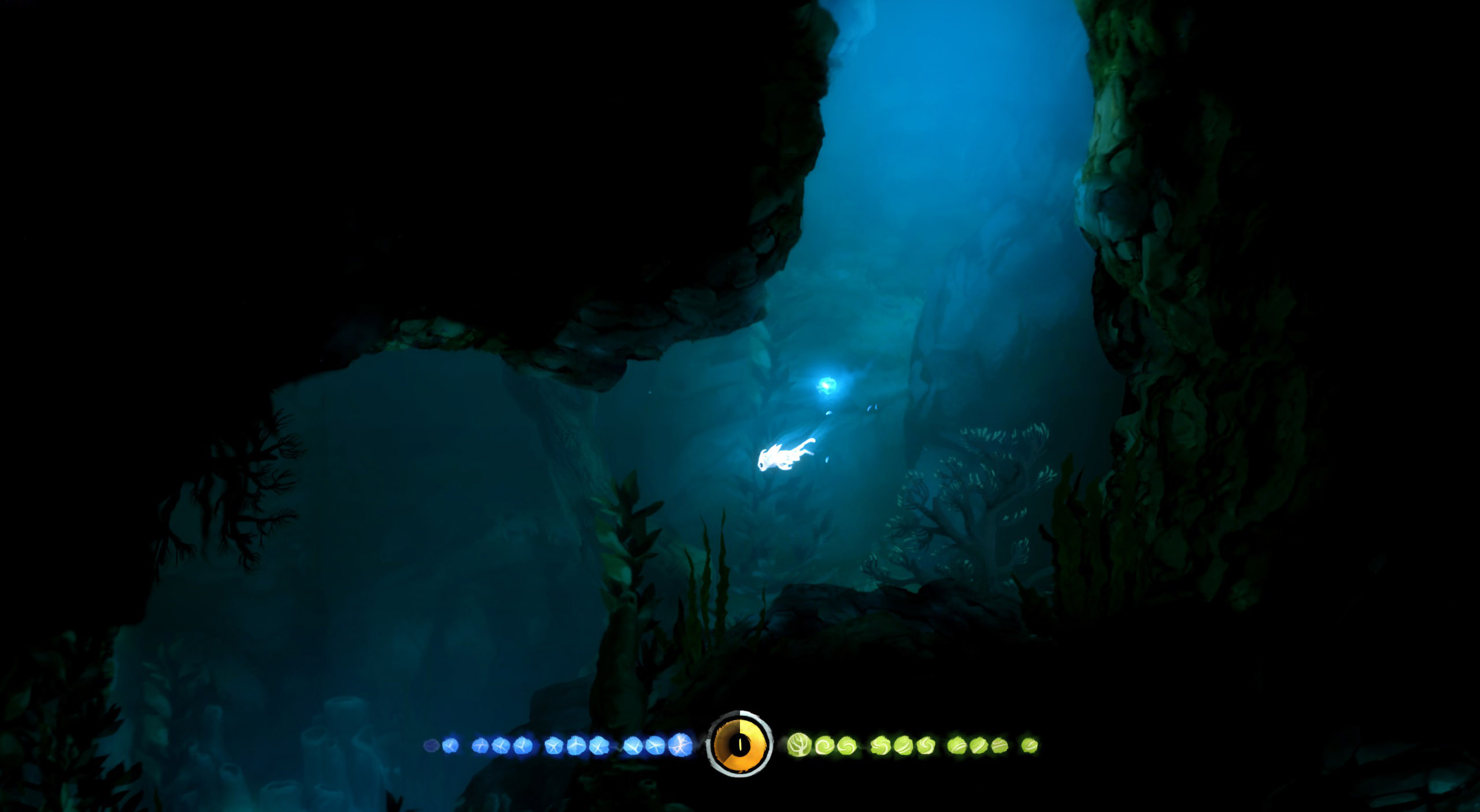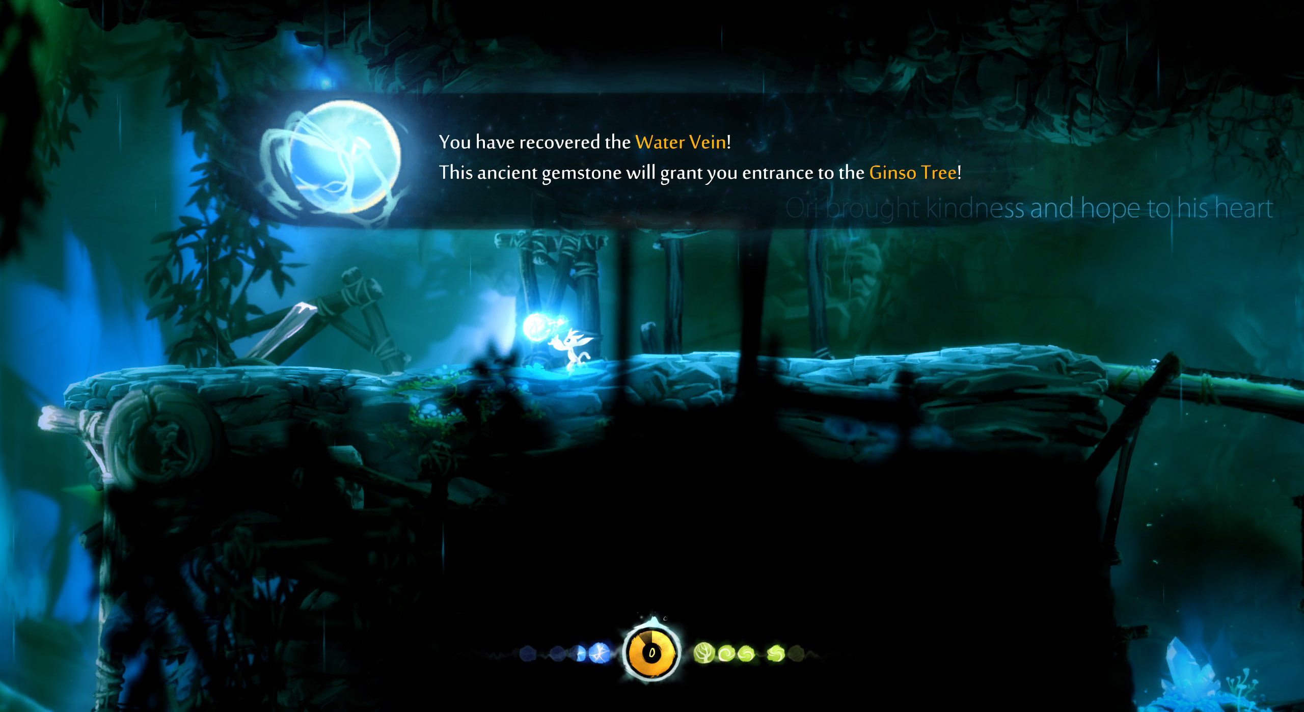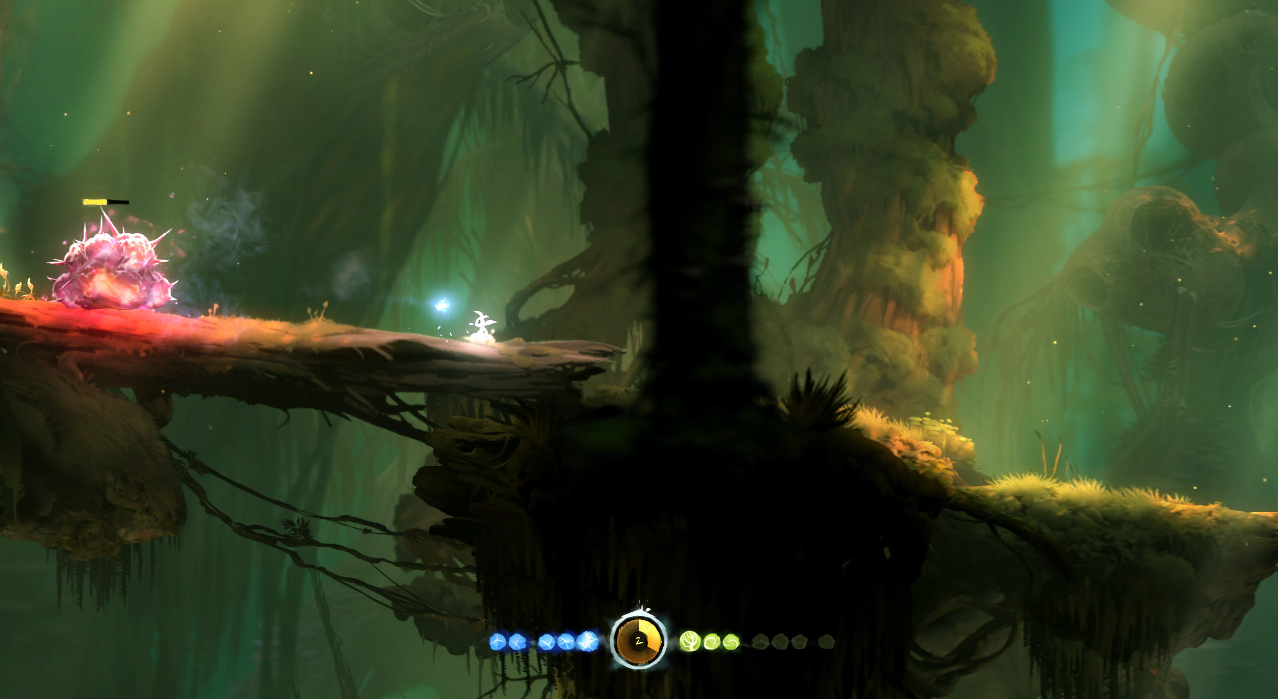 From the onset Ori and the Blind Forest is just stunningly beautiful, everything appears hand painted similar to the recent Rayman games, and I would say I preferred Ori’s art style over Rayman’s. The game starts with Ori, a white guardian spirit, who falls from the Spirit Tree as essentially a newborn. He is adopted and cared for by Naru, a sort of cute gorilla like creature. Unfortunately the forest begins to wither and die and Ori is left to explore the forest with the aim of restoring it on his own. Like Pixar’s film Up Ori’s intro sequence’s storytelling is so involving and affecting that it really made me care about the characters in only a few minutes. Ori is joined on his adventures by Sein, a ball of light, who guides and helps fight the many enemies encountered.