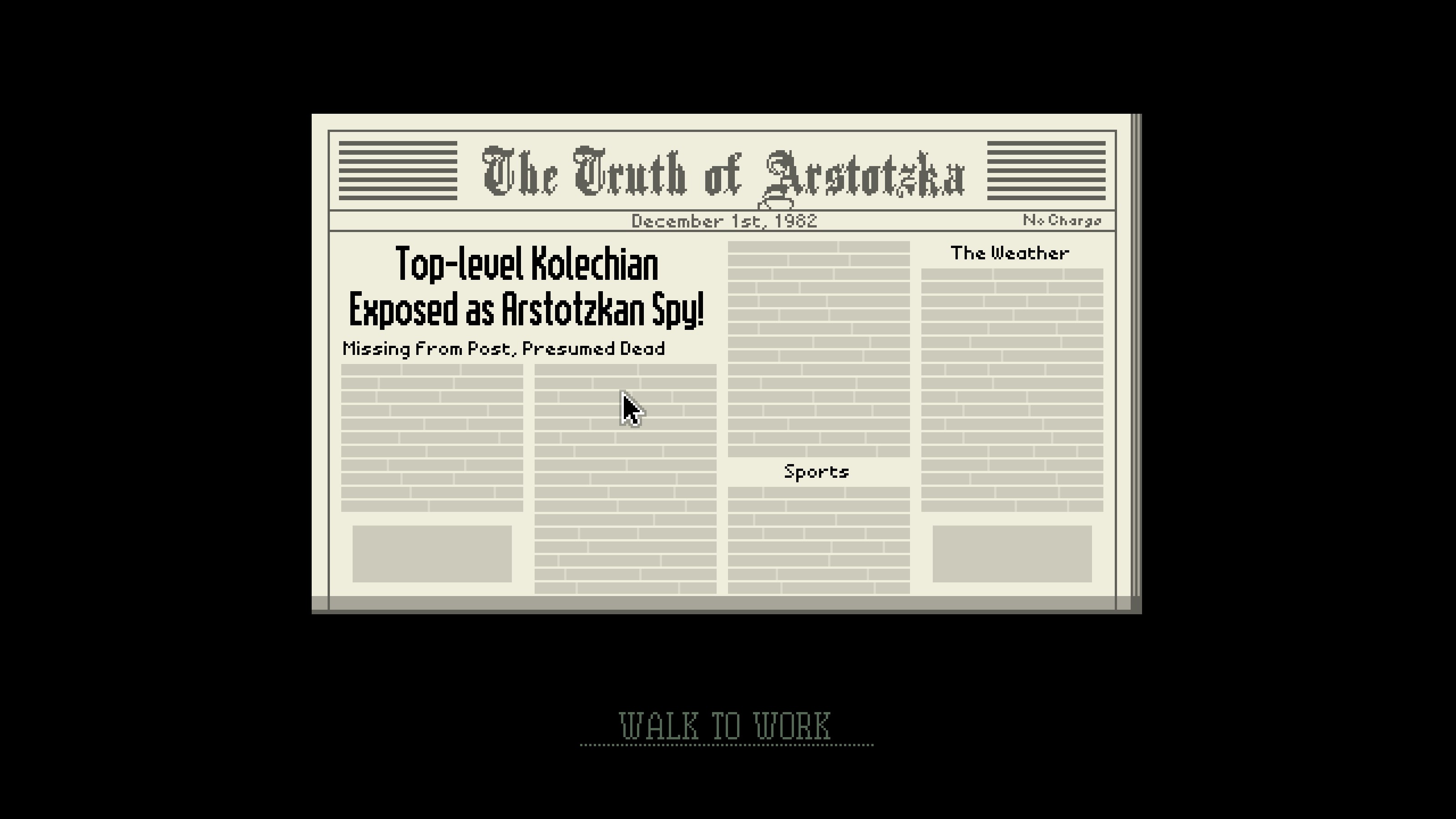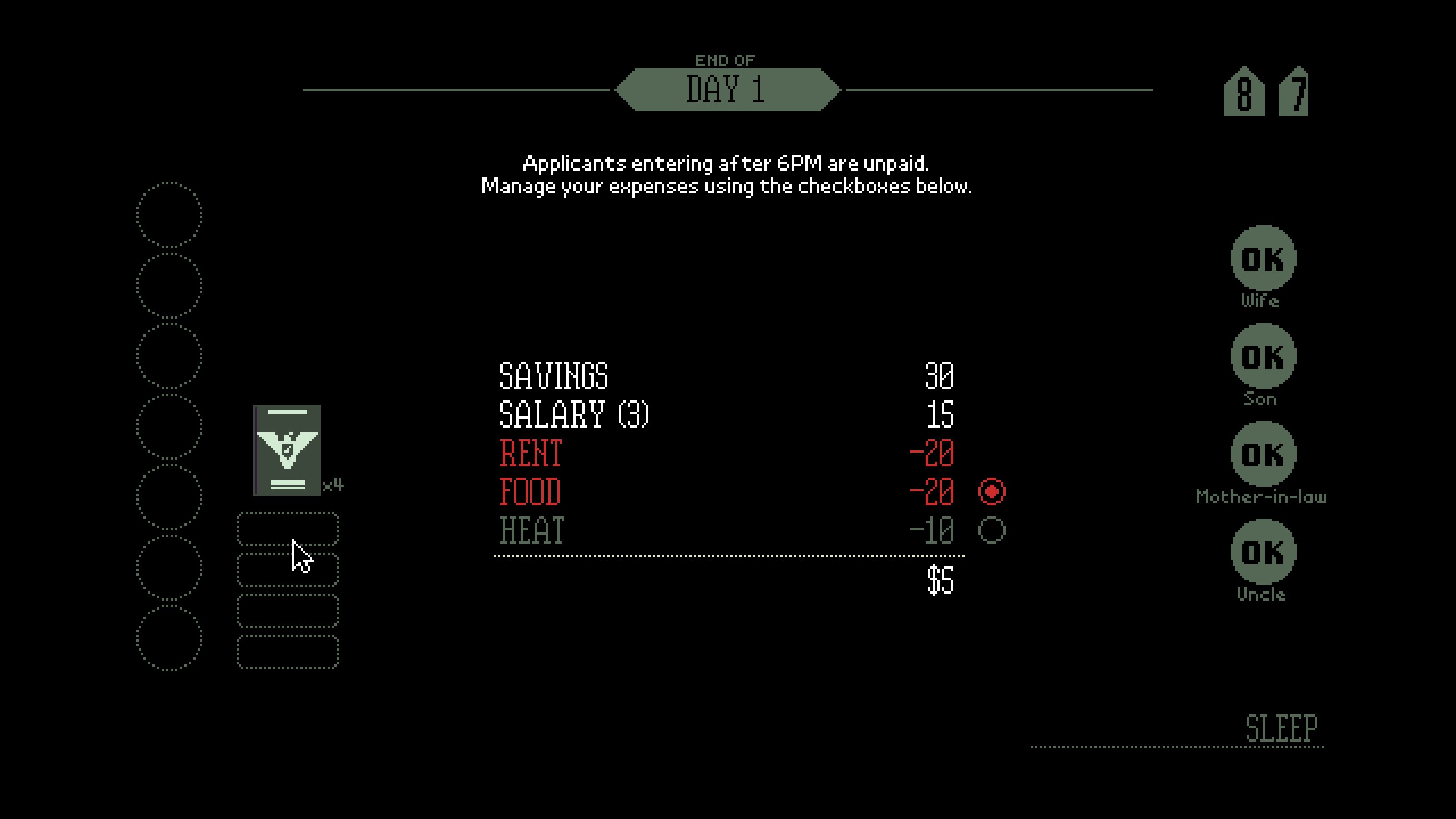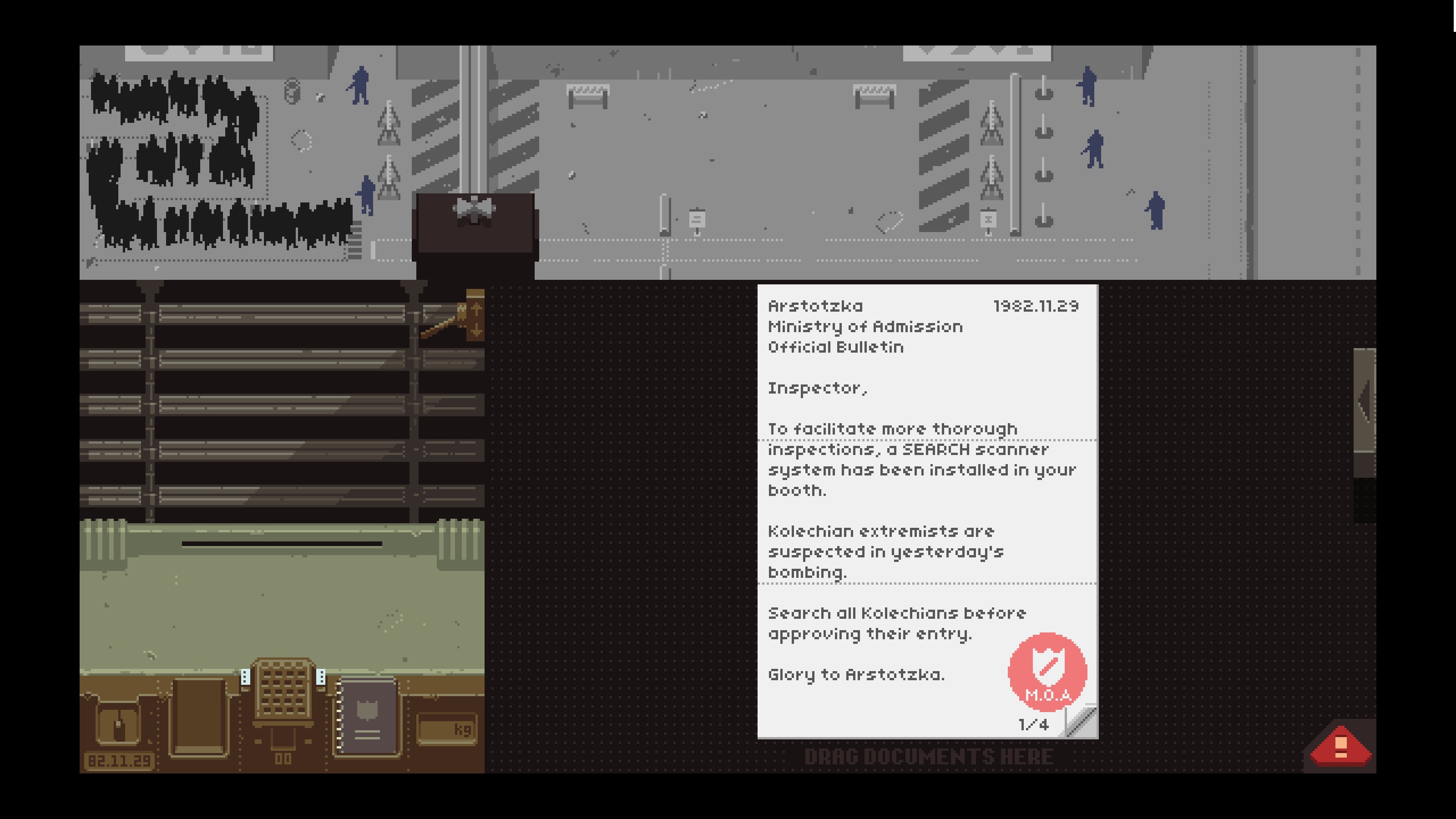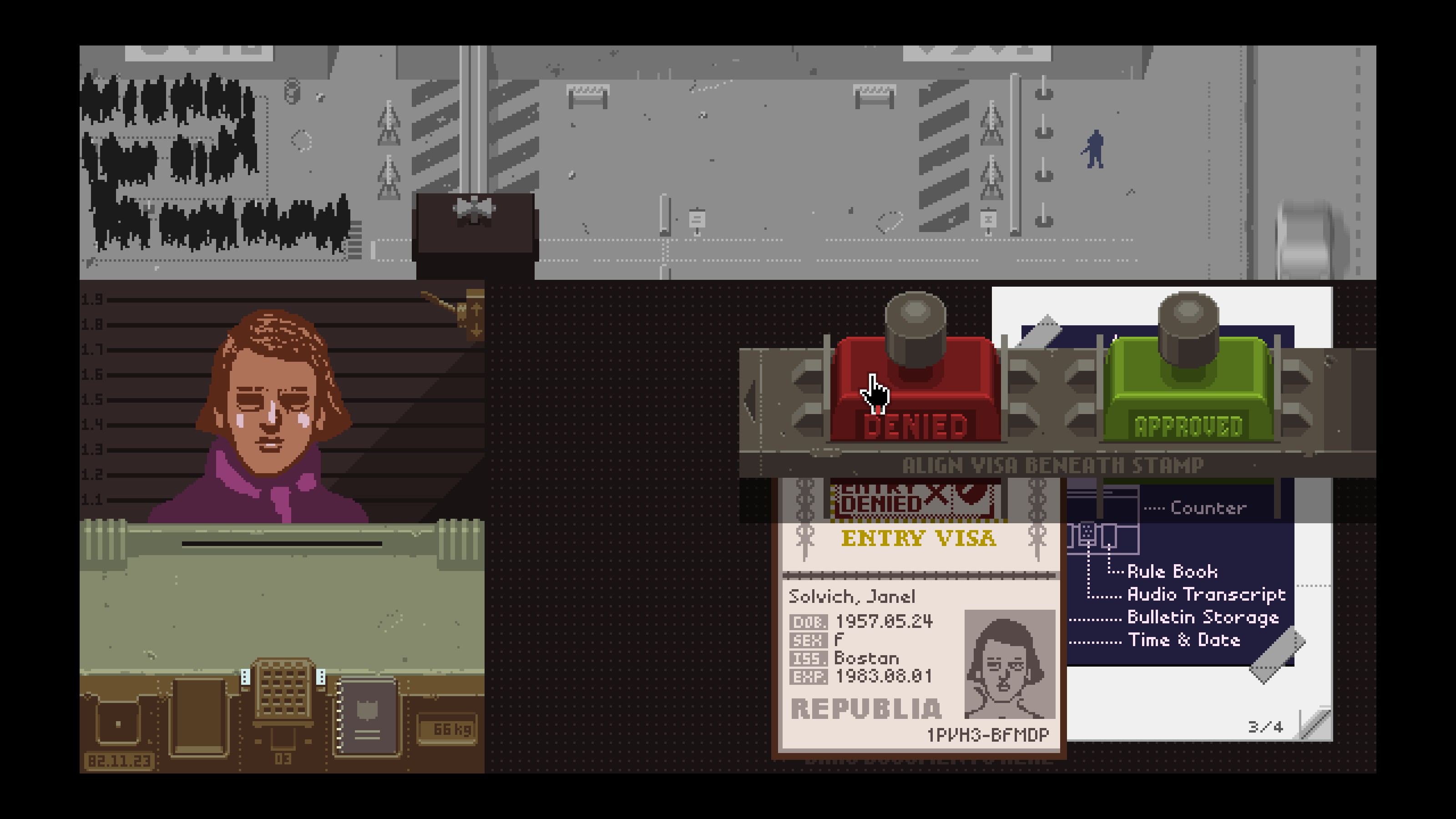 You spend the bulk of the game at your passport office which has an area to view the immigrant, a desk to read documents on and a small area to store documents away. Immigrants come to your desk, having being called by your loudspeaker and present the documents they have to try and gain access. Sometime the documents are correct, sometimes they’ve made a mistake that can be corrected, sometimes they have forged the documents, sometimes they have a bomb, sometimes they’re illegally trying to gain entry, etc. The game’s objective is to keep your family alive by processing as many people per day correctly in order to make the most amount of money to pay bills, buy food, get medicine, etc. A number of people will come to your desk with offers that you improve your chances but sometimes at risk to yourself. For example one of the border police will offer to give you a cut of his money for every person you detain and a shady organisation will keep popping up asking you to help members gain entry.