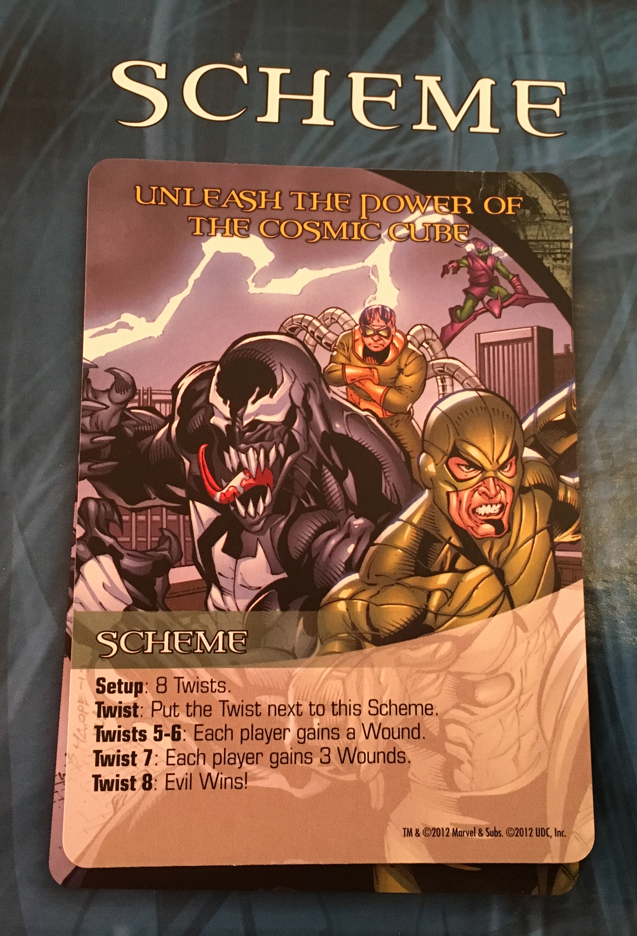 So in one game Magneto may be trying to Unleash the power of the cosmic cube, where if scheme twist cards are revealed from the villain pack, the game becomes more and more difficult, if 8 twists are revealed the game is over and evil wins. The masterminds come with henchmen and lesser villain groups. The heroes have a selection of about 5 or 6 characters per game, of which each character has a dozen or so cards. Once per player turn a villain enters the city or an event occurs, depending on what is revealed from the villain deck.