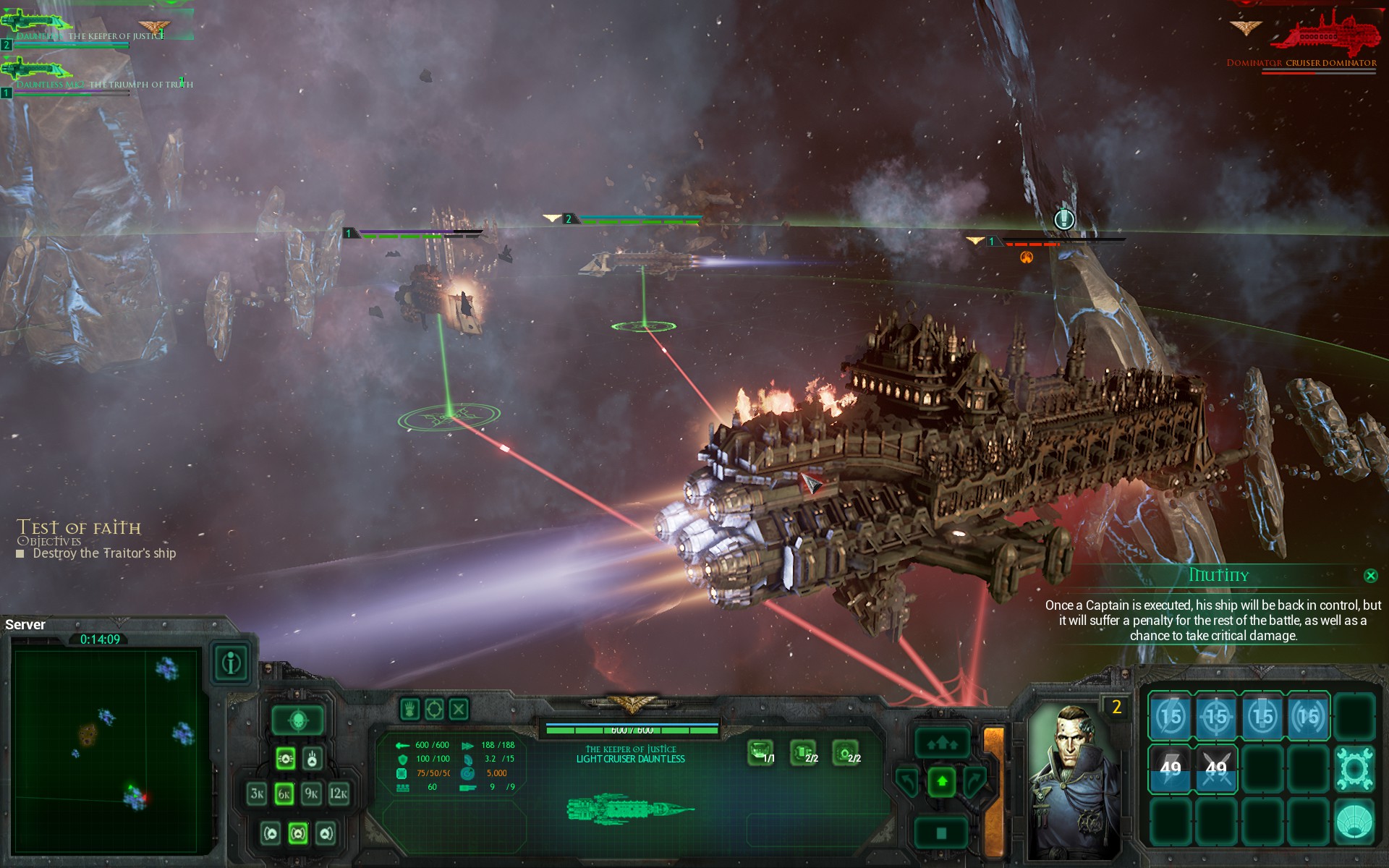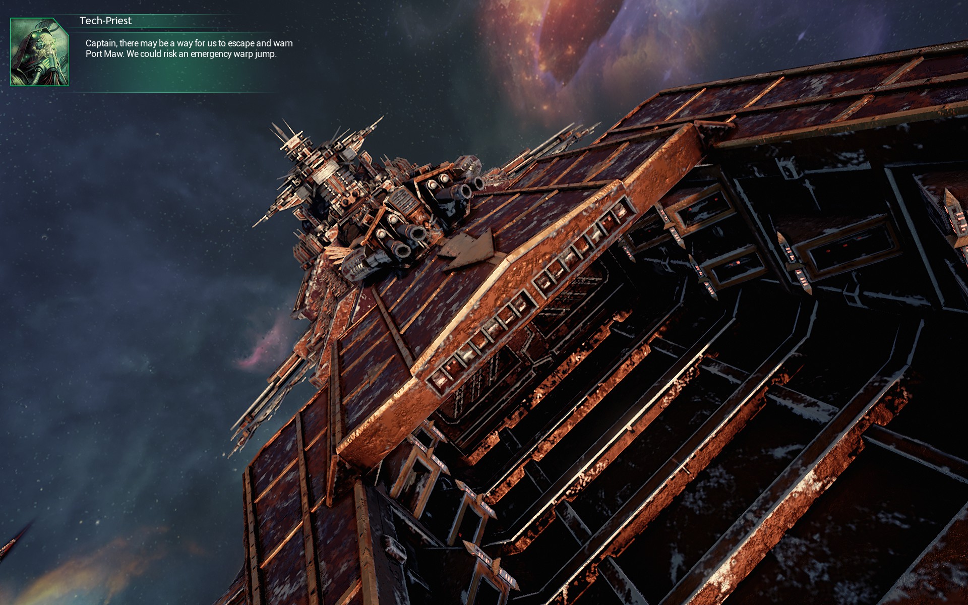 At the beginning of each mission you select the positions from which to deploy your ships and from then the mission is real time. It’s important to note that you only have a handful of ships so you must get personal and micro-manage each ship. Each ship has different weapons with different ranges, angles of attack, shields, cooldowns, etc. so one ship might be good at breaking shields from a distance while another is better suited to getting in the personal space of enemy ships in order to finish off their hull. The game gives you a bunch of tools to help with this so at the start of each mission you’ll select the preferred attack distance and attack angle for each ship. During the thick of it you have the ability to manoeuvre your ships in a number of different ways using a regenerating power pool. For example, as an Ork you may wish to boost to get into close proximity in order to ram the enemy, emergency stop to avoid mines or turn rapidly to keep your ship forward facing the opponent. On enemy vessels you can pick what to target primarily, be it weapons, power, engines, etc.
